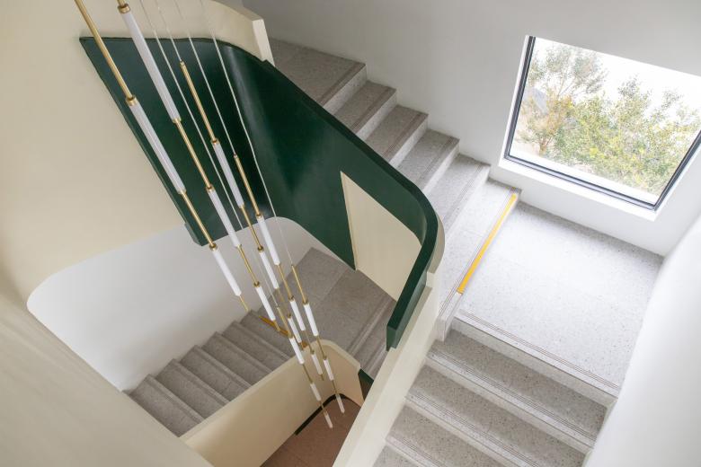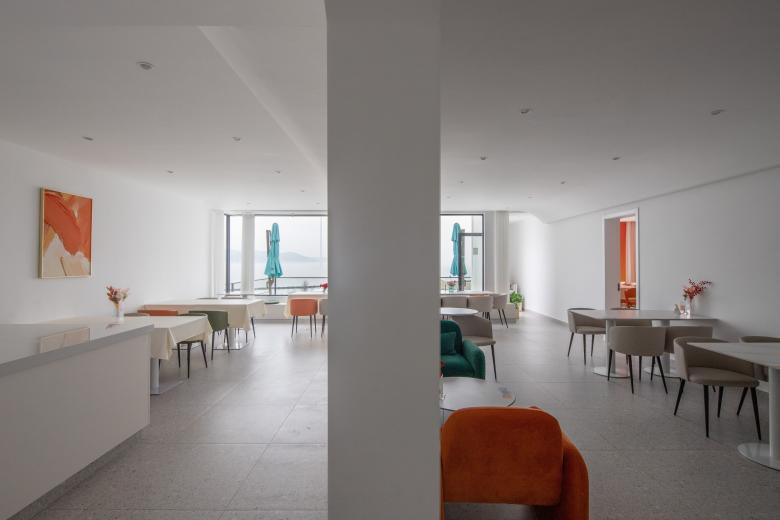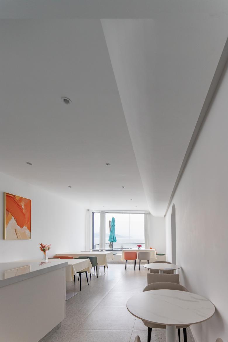 得益于将原窗户和门都拆除使得旧建筑和新加建的部分更加连贯使用面积也扩大了许多,我们将吧台依附于新旧交接的墙体置入空间当中,这样整个大厅就能以咖啡吧台为核心连接和辐射整个空间,较长的吧台在空间交接的地方用圆弧的方式来引导人们过渡到空间的另一端,右侧新建的副楼则用做店主平时接待一些私人朋友的区域,空间整体以干净整洁的白色调为主,家具上点缀些许色彩,室内吊顶和楼梯都用了层叠弧形作为基础语言的构件包裹空间,亦如湖水推到岸边溅起水花时的回流碰撞。