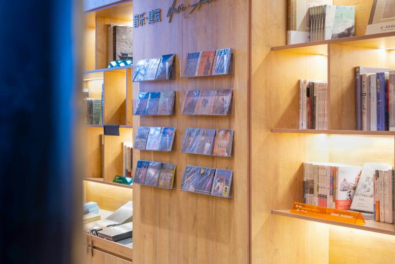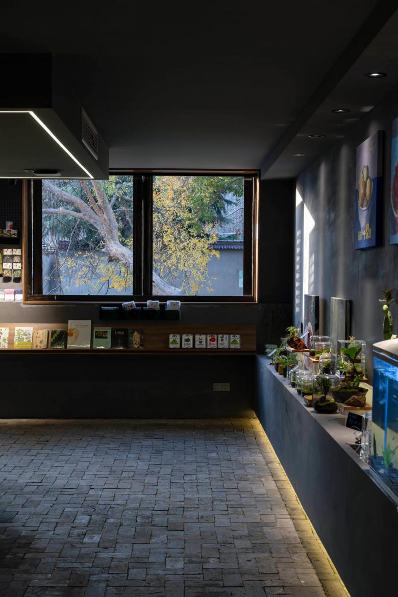 项目拥有一个别致的围庭,空间结构多样。在改造上,主形体延续原有结构,整体设计中书店通过“空间的延伸”、“新细胞的重组”的空间重塑,在保留原有建筑基础上,让周围的元素融到空间里模糊边界,成为自然手法后的新生。当阳光穿过窗,一城、一石、一树仿佛在满溢芳香中苏醒。