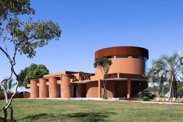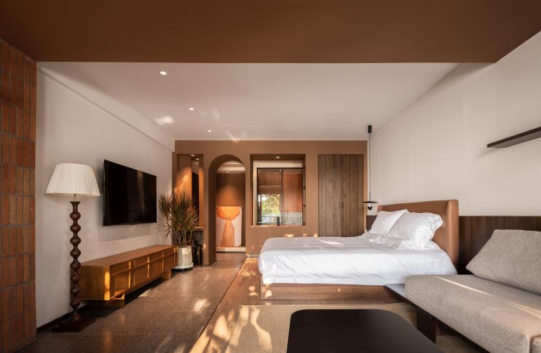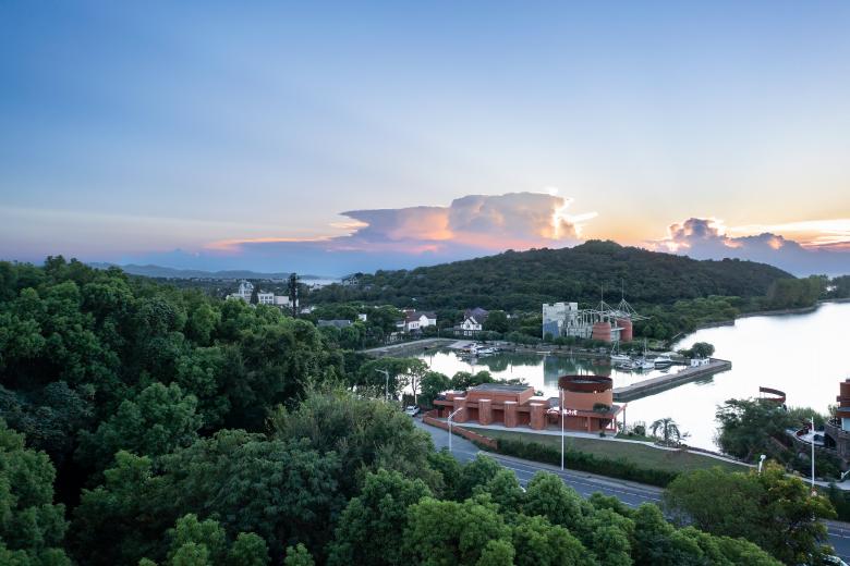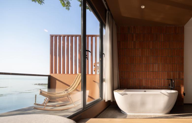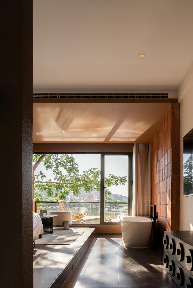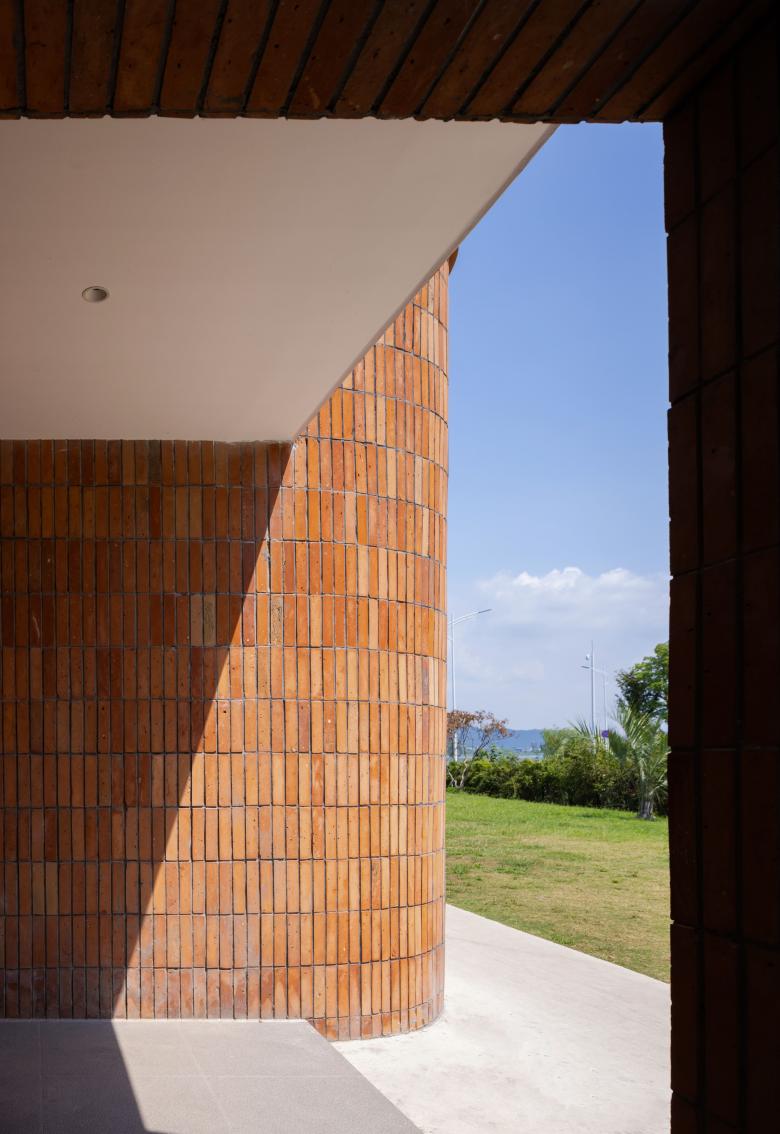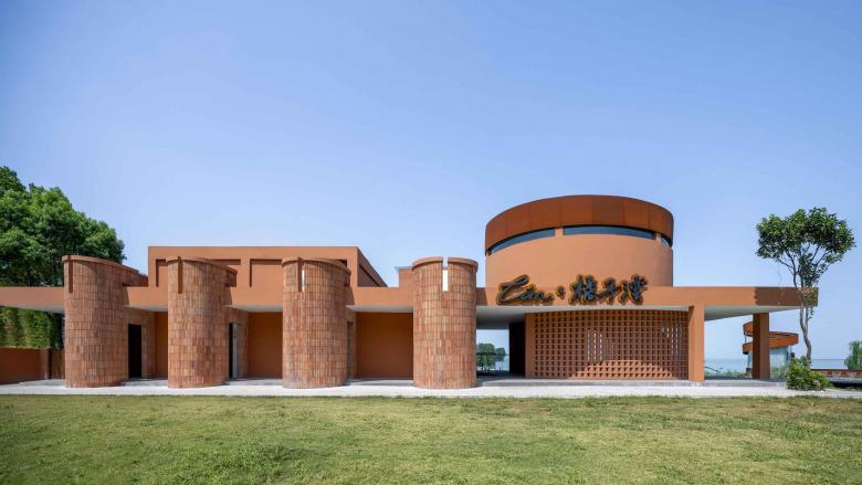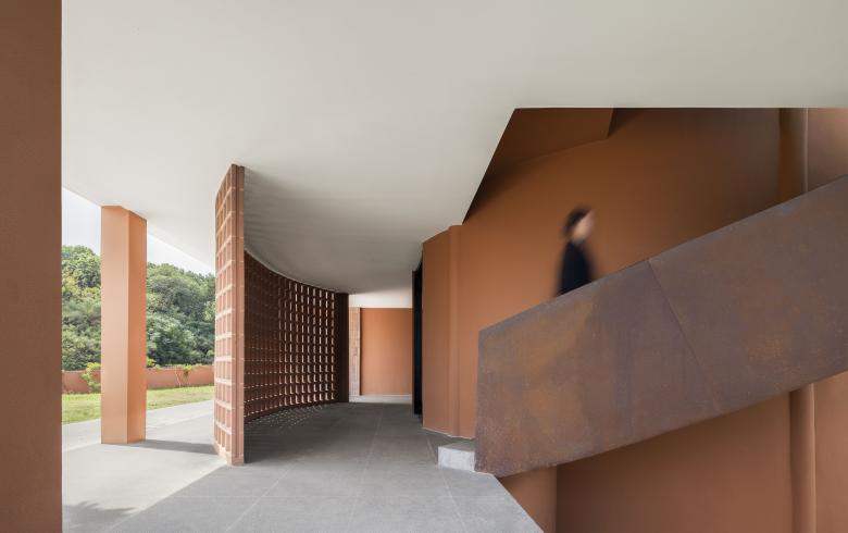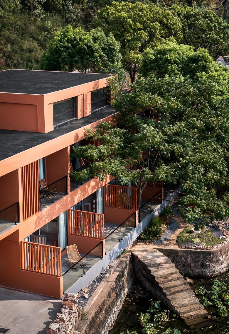空间整体以陶土的砖红色为基本色,灵感来源于从场地望向太湖的夕阳。不同于中式山水画的黑白,自然界的色彩是丰富而热烈的。因此民宿主体部分采用了粗糙质感的涂料,小圆筒体量用陶砖贴面强调。简单的建筑造型和质朴的材质互相衬托,同色系不同材料让建筑立面的丰富度和可读性得以提升。热烈的色彩刺激人们的感官,在落日时,这种感受将达到顶峰。建筑物既是作为框景存在的画框,也可以是以自然为背景的视觉主体。