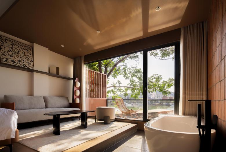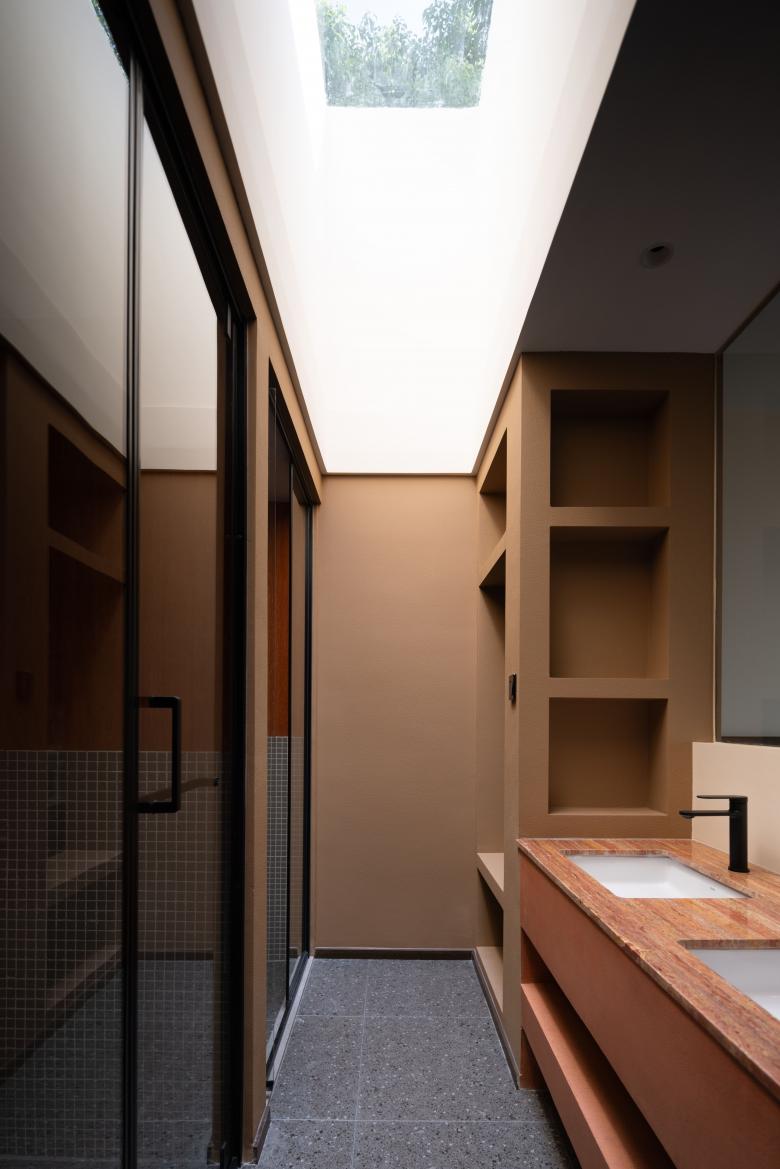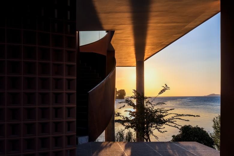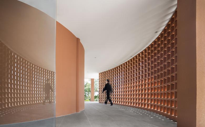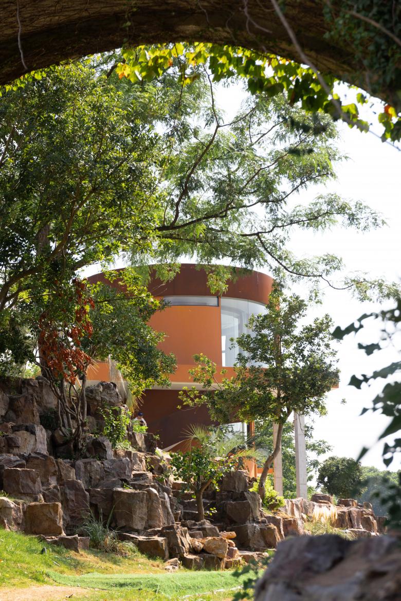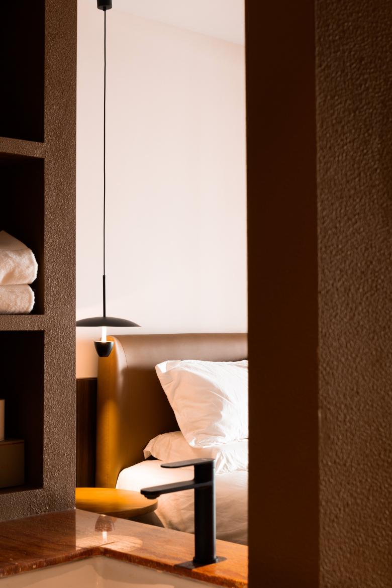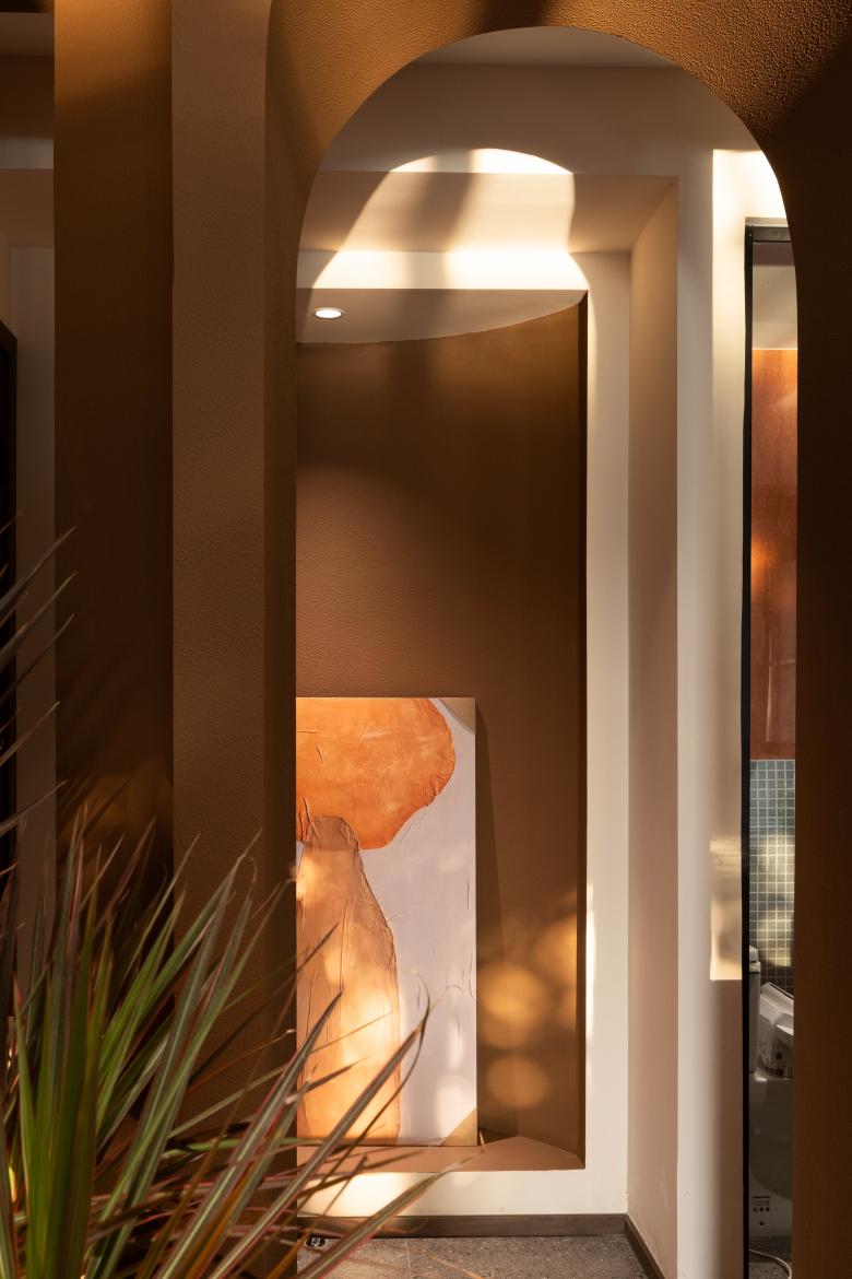 空间整体以陶土的砖红色为基本色,灵感来源于从场地望向太湖的夕阳。不同于中式山水画的黑白,自然界的色彩是丰富而热烈的。因此民宿主体部分采用了粗糙质感的涂料,小圆筒体量用陶砖贴面强调。简单的建筑造型和质朴的材质互相衬托,同色系不同材料让建筑立面的丰富度和可读性得以提升。热烈的色彩刺激人们的感官,在落日时,这种感受将达到顶峰。建筑物既是作为框景存在的画框,也可以是以自然为背景的视觉主体。