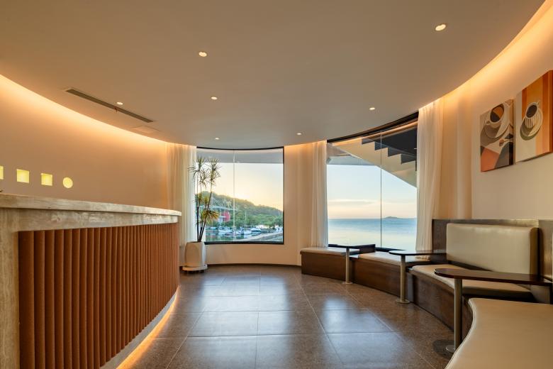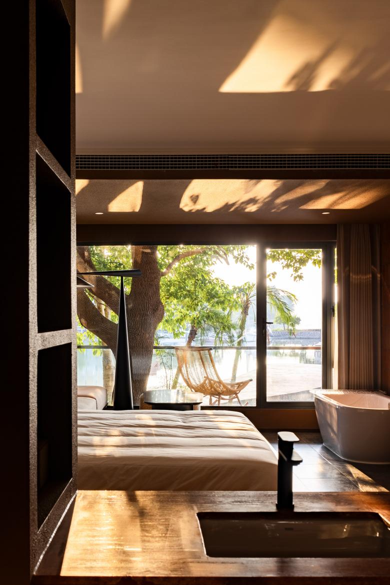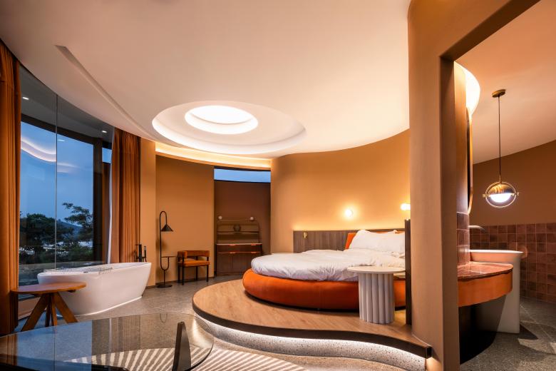 民宿共9个房间,分为4种主要户型。存量的大圆筒,改造后-1F用于布草等后勤空间,1F为民宿接待空间,面向湖面为落地窗,最大化利用自然风景。长方体主体部分均匀分布8个房间。其中一层结合建筑体量,设计成中间2个LOFT房型,以及两侧的天窗大床房。方和圆的体量通过一个大的平台整合,底图的体量穿过大平台升起,圆筒的2F设计成新的客房,另一侧长方体之上则升起不同体量的长方体,在立面构图上延续了几何美感的同时,建筑物内部也形成了丰富的空间和光线效果。