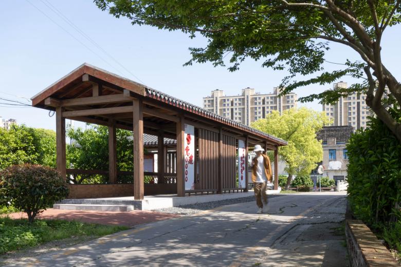 廊架呈波浪形,使用乡土材料搭建,连接河岸两侧空间,同时也成为了村子的“地标”。