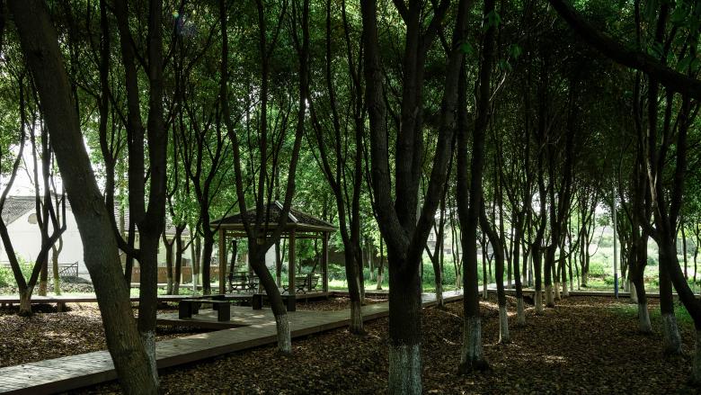 栈道位于村南部的樟树林,长期闲置,杂草丛生,沟渠积水脏臭。我们通过栈道贯通树林,方便村民通行,设置凉亭、座椅,形成一个舒适的林下空间。