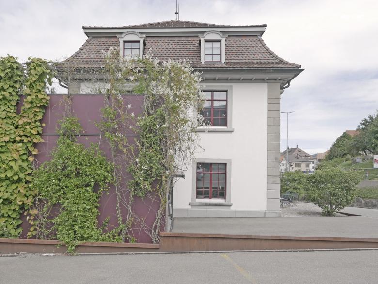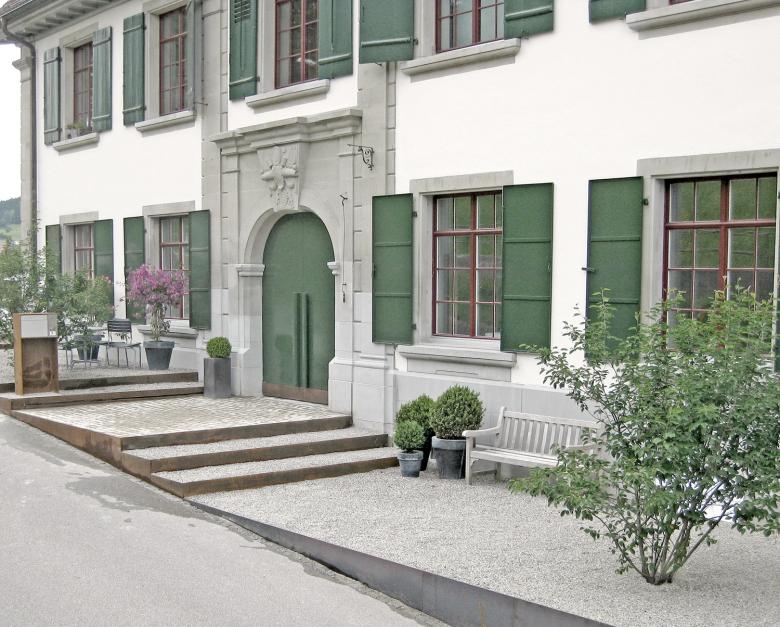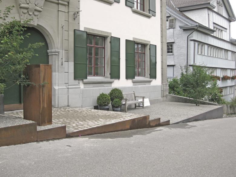 Das unter Denkmalschutz stehende, einstige Zeughaus wurde durch die neuen Besitzer sorgfältig renoviert. Die Umgebung des Zeughauses sollte den Ansprüchen des Denkmalschutzes entsprechen, zugleich aber durch eine zeitgemässe Gestaltungssprache die Verbindung in die Gegenwart herstellen. Die repräsentative Fläche beim Eingang wurde durch Stahlbänder gefasst und terrassiert. Ein mit antikem Kopfsteinpflaster belegter Platz mit indirekter Beleuchtung bildet den Hauptzugangsbereich. Zwei grosszügige Abtreppungen führen jeweils zu einer erhöhten und einer tieferliegenden Kiesfläche mit Strauchpflanzungen. Auf Wunsch der Bauherrschaft wurden Briefkasten und Gegensprechanlage in der gleichen Gestaltungssprache gehalten und ebenfalls mit einem Stahlgehäuse ausgestattet. Eine feinere Abtreppung mit Stahlbändern flankiert auch die Zufahrt zur modern gehaltenen Garage auf der Westseite des Zeughauses. Der Anbau schmiegt sich, mit einem feinen verspielten grünen Schleier aus Kletterpflanzen, harmonisch an den Hauptbau an.