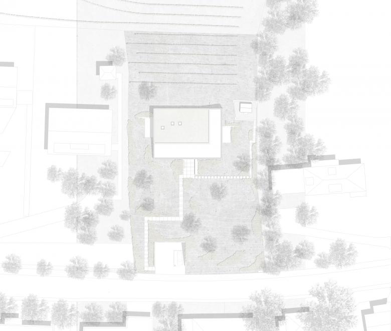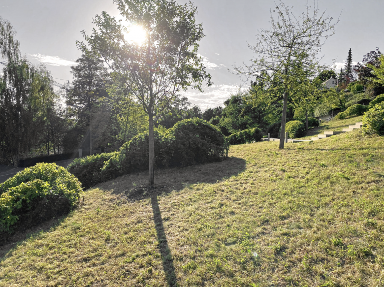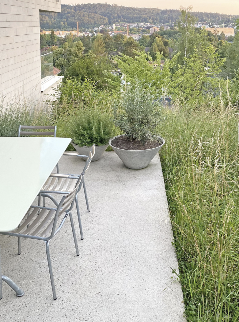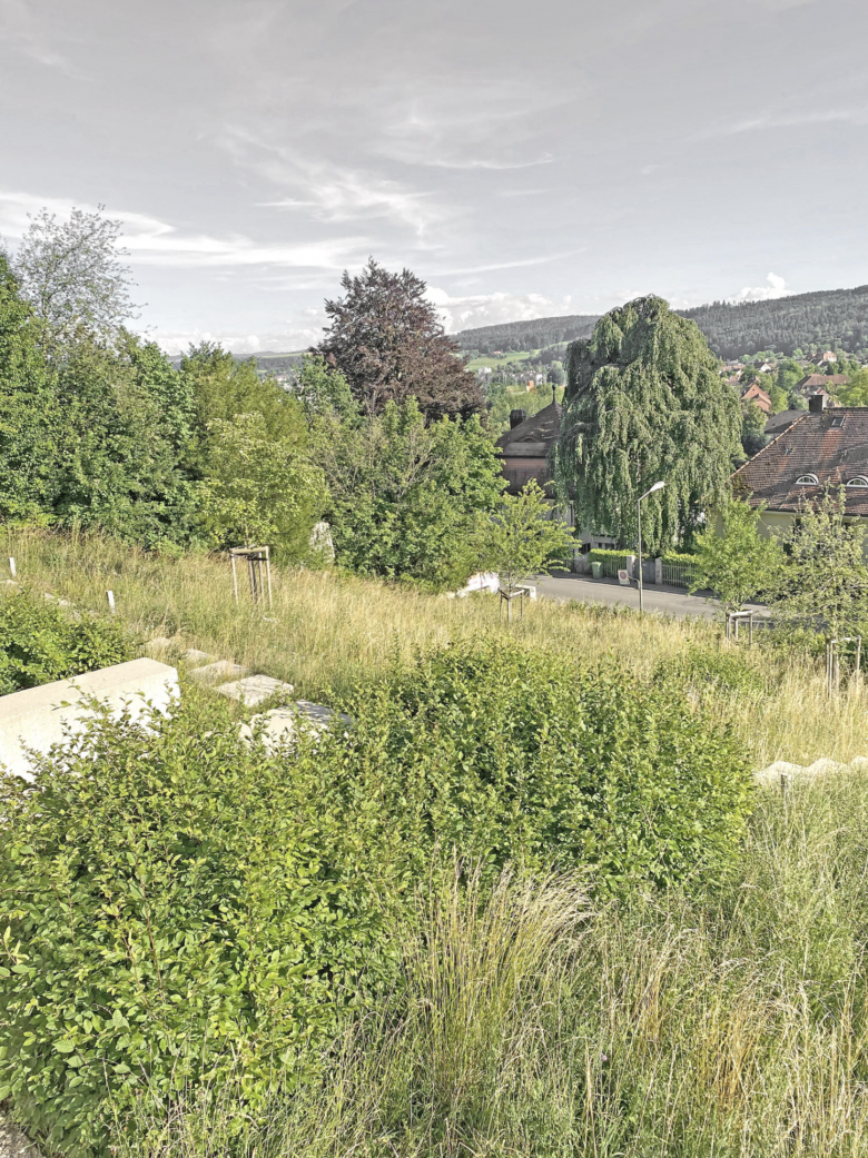 Das auf einer der letzten freien Parzellen, am Südhang des Lindberges in Winterthur realisierte Mehrfamilienhaus wurde geschickt in die Hanglage integriert. Weite, offene Grünflächen umfliessen die markante Baute, welche mit einer hellen Natursteinfassade verkleidet ist, und betten diese harmonisch in die Umgebung ein. Der natürliche Geländeverlauf zieht sich von der Rychenbergstrasse hoch zu den Rebbergen bis hin zum Bäumliweg. Attraktive Wildblumenflächen und amorph geschnittene, einheimische Hainbuchenwolken wechseln sich bis zu den bestehenden Rebanlagen harmonisch ab. Ergänzt mit verschiedenen Obstbäumen, teilweise ProSpeciaRara, wird dieses landschaftliche Bild zusätzlich verstärkt und setzt einen Bezug zum ehemaligen Bestand als lockerer Baumhain auf einer Magerwiese. Die gezielte Setzung der Hochstammbäume lässt den Blick aus den Wohnungen über die Stadt Winterthur gleiten. Ab dem Vorplatz mit Besucherparkplatz und der Tiefgaragenzufahrt führt ein streng geometrisch angeordnetes Wegesystem zum Hauptzugang, sowie weiter über einzelne Schrittplatten und einem Treppenlauf zum bestehenden, denkmalgeschützten Rebhäuschen. Auf die Materialisierung wurde grossen Wert gelegt. Die Betonplatten und Blockstufen wurden, wie weitere Elemente im Garten aus gestocktem Beton gefertigt. So sind neben dem markanten Mauerblock beim Eingang auch die wenigen Stützmauern und die Sitzplätze der Erdgeschoss Wohnungen aus gestocktem Beton realisiert worden. Eine schlichte Beleuchtung ergänzt die Umgebung.