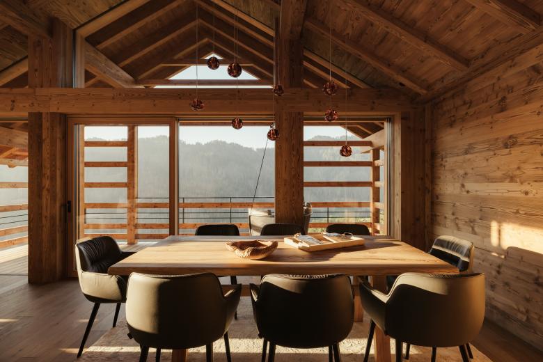 I piani superiori, separati e dotati di tetti a due falde orientati verso sud, richiamano il carattere autentico del maso locale. Il piano terra rivestito in pietra naturale e i due piani superiori in legno rispecchiano l’architettura tradizionale della regione, mentre il design chiaro e angolare offre una reinterpretazione moderna dello stile alpino.