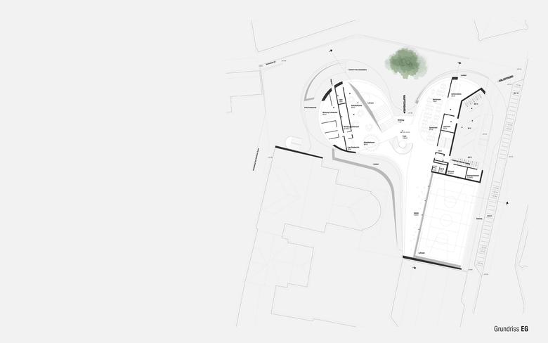 Kommen wir nun zur Stadt: Mitten in die Stadt setzen wir nun dieses "Turmdoppel". Seine geschwungene Kontur vermittelt zwischen Sillgasse und Paul-Hofhaimer-Gasse, geleitet SchülerInnen, LehrerInnen und PassantInnen selbstverständlich ins Innere dieses innerstädtischen, offenen Hofes zwischen diesen beiden Gassen, markiert logisch den Haupteingang und weicht nicht zuletzt dem Baumbestand aus, der somit identitätsstiftend erhalten werden kann.