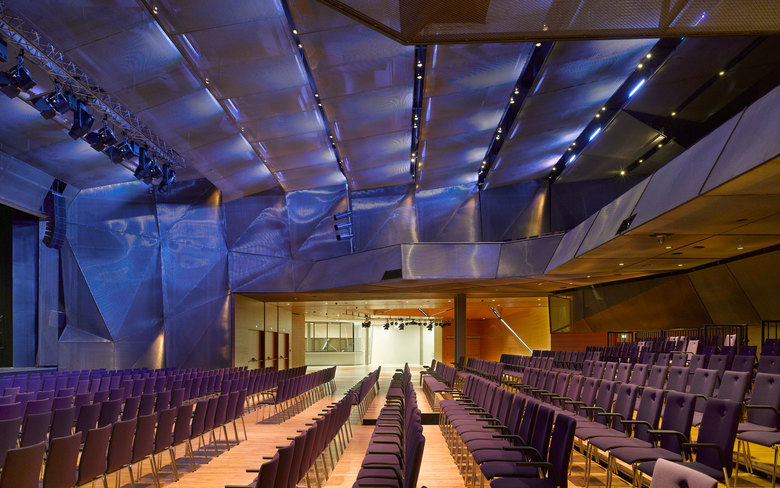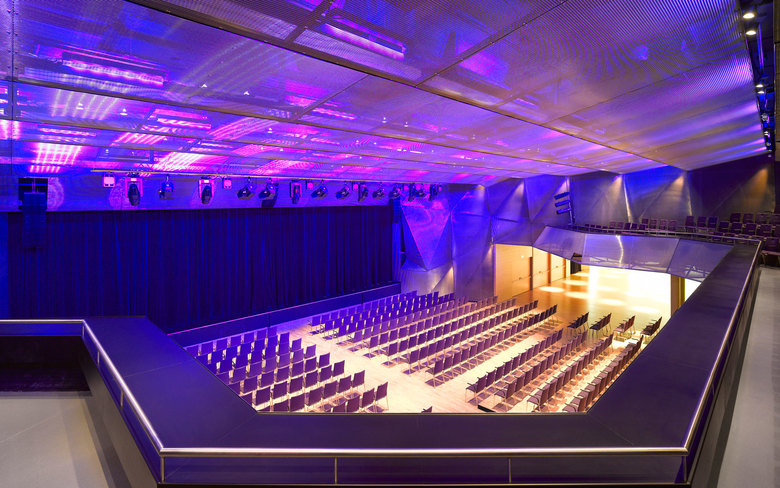 Der kleine Saal selbst ist über einer polygonalen Grundfigur angelegt, die leicht ausgedreht eine tiefere Blickwirkung über die Diagonale des großen Saales hinweg erzeugt und damit eine gewisse Ausrichtung zum Bühnenvorbereich des großen Saales intendiert. Es ist angedacht, auch die Trennwand zum Foyer partiell als mobile Wand auszuführen, womit eine größere Öffnung zum Foyer/Barbereich hin ermöglicht würde und damit einen großen zusammenhängenden Veranstaltungsbereich erzeugt. Der kleine Saal ist mit einem Glasoberlicht versehen und erhält dadurch – insbesondere für Konferenzen – Tageslicht.