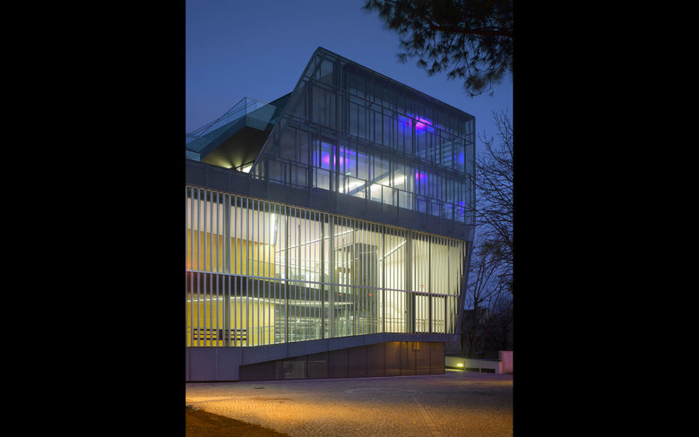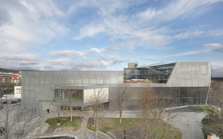 An der Seite des Schubertplatzes reagiert der Baukörper in den beiden obersten Geschoßen mit einem u-förmigen, hofähnlichen Ausschnitt auf die anliegenden Strukturen, die sich als Gebäudecluster um hofförmige Einbuchtungen gruppieren. Diese Einbuchtungen sind in maßstäblich transformierter Weise nochmals räumlich im Foyer im Zusammenhang mit der Garderobenanordnung, dem Ticketschalter und dem Bookshop erlebbar, im Obergeschoß im Bereich der neu geschaffenen Bar und den anliegenden Seminarräumen. In den unteren Geschoßen tritt die neu geschaffene durchlaufende Glasfassade mit Vertikallamellen als Hauptfassade zum Schubertplatz hin in Erscheinung. Hier wird der öffentliche Charakter des Bauwerkes deutlich zum Ausdruck gebracht. Der Platzraum fließt in das Innere des Gebäudes, das damit ein Teil des öffentlichen Raumes wird, während anders herum das bespielte Foyer als gesellschaftlicher Ort für den Beobachter von außen erkennbar wird. Aus dieser Fassade entwickelt sich eine neu zu schaffende Brücke heraus, die die bestehenden räumlichen und konstruktiven Anknüpfungspunkte benützt. Im Gegensatz zur Bestandsbrücke weitet sich der neue Teil trichterförmig zum Foyer im Obergeschoß hin auf. Unter dieser Brücke wird in Analogie zum Bestand der neue Haupteingang als gedeckter Bereich konzipiert.
