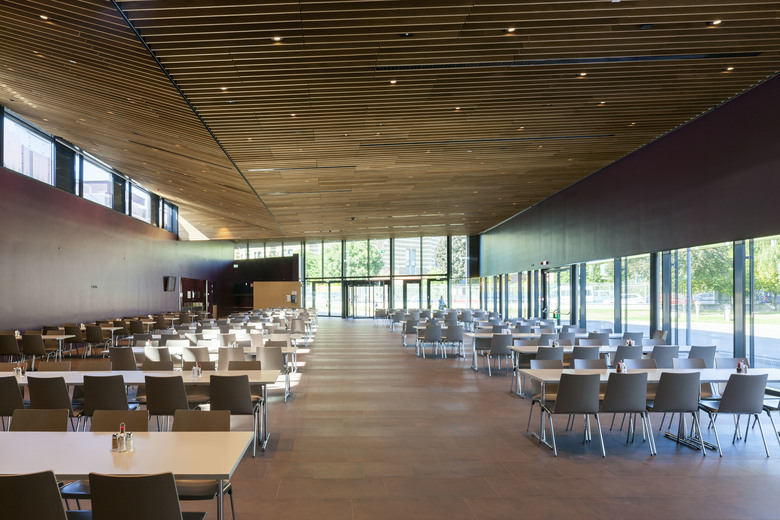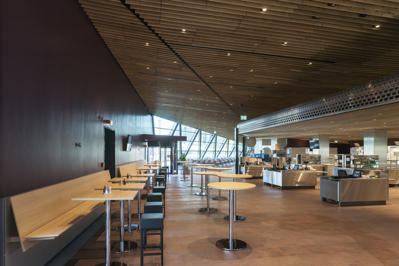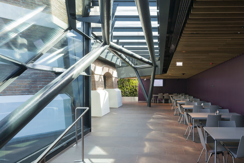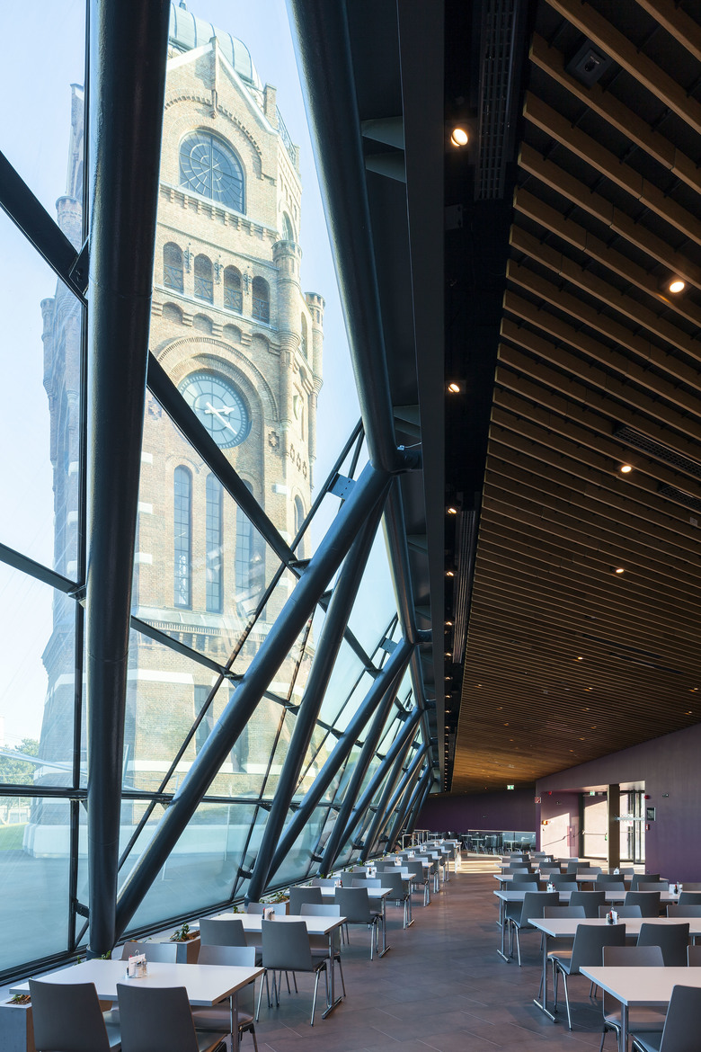 Um die Beziehung zwischen und zu diesen beiden Baudenkmälern für den Gast erlebbar zu machen, erstreckt sich der Speise- und Cafeteriabereich ebenfalls über die gesamte Länge des Gebäudes und öffnet sich hauptsächlich zu diesen hin.
