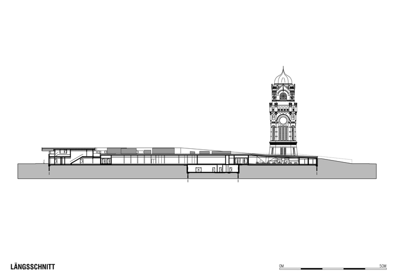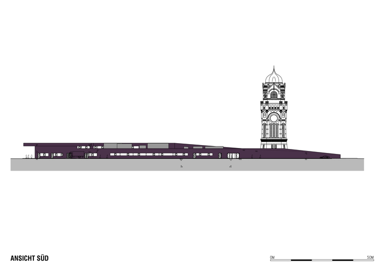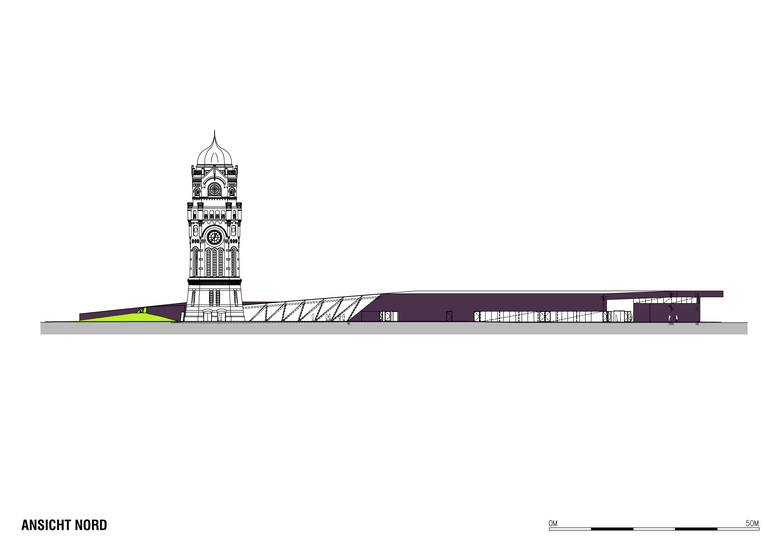 Äußerst skeptisch stehen wir der vorgegebenen Außentreppe als Annex des Turms gegenüber: eine solche ist aus unserer Sicht mit der Integrität und Autonomie des Baudenkmals unvereinbar. Einer Logik des "kleineren Übels" können wir ebensowenig folgen. Wir verfolgten daher folgende fundamentale Strategie: