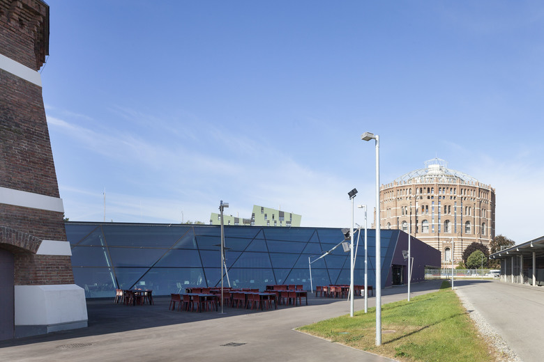 Das Kulinarium als Kommunikationszentrum der Wiener Netze ist symbolträchtig in jenem Raum situiert, der zwischen zwei besonderen Baudenkmälern aufgespannt wird: dem Gasometer und dem Wasserturm.