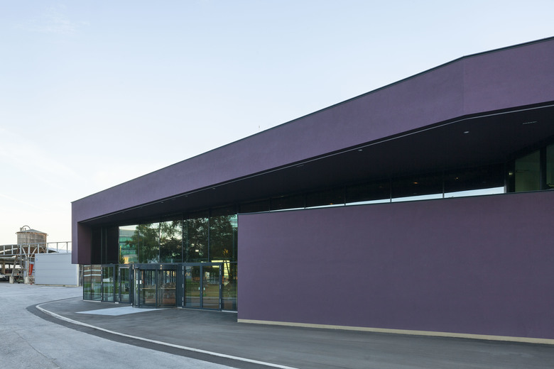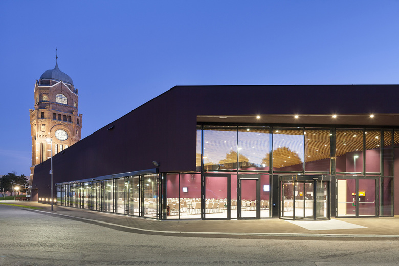 Betriebsrestaurant/Kommunikationszentrum und denkmalgeschützter Wasserturm verschmelzen so zu einer vollkommen schlüssigen Einheit.