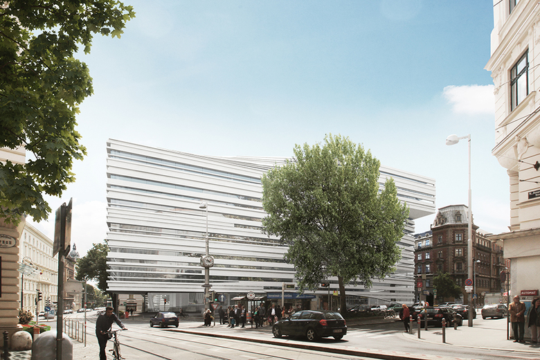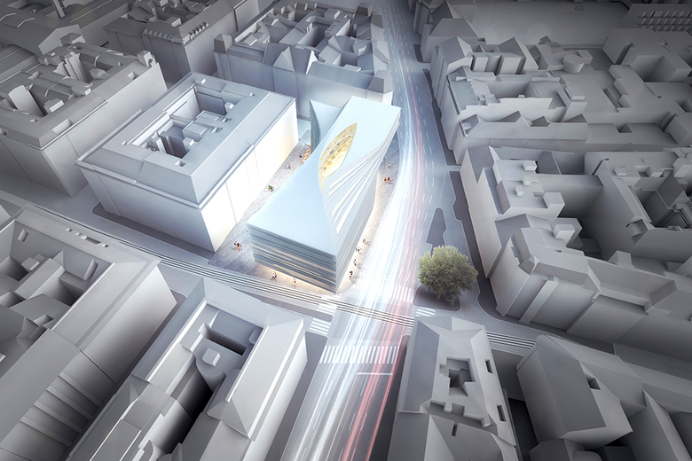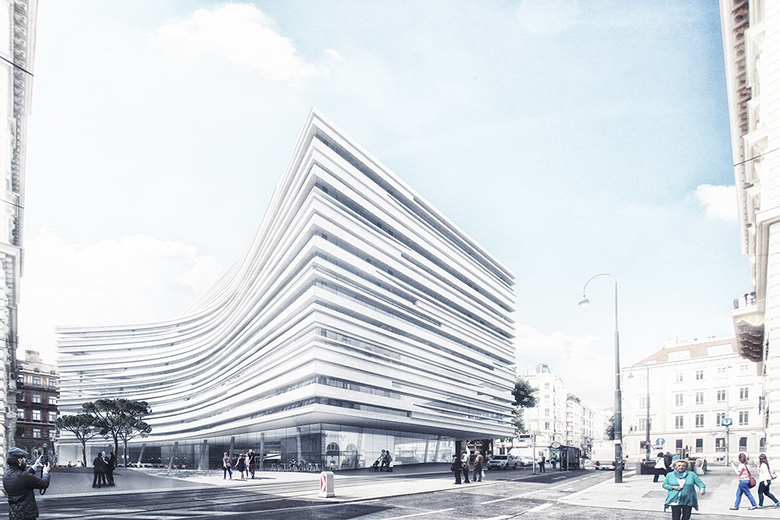 Höhe, hier anzubieten. Dazu fehlt schlicht der Genius Loci, der dies verlangen, geschweige denn ein Programm, das dies gestatten würde. Dennoch kann man nach Freiheiten forschen, die sich innerhalb der so stark gegebenen Rahmenbedingungen auftun und für Verbesserungen sowohl für den Stadtraum als auch für die Gebäudetypologie des gewünschten Neubaus sorgen. Ganz wesentlich für eine solche Weiterentwicklung ist die Betrachtung des Freiraums; einerseits jenes dreiecksförmigen Richtung Josefstadt, andererseits jenes am Ende der Rathausstraße. Der Wunsch, letzteren neu zu artikulieren und zu definieren, führte entscheidend zu neuen Freiheitsgraden für das Projekt.
