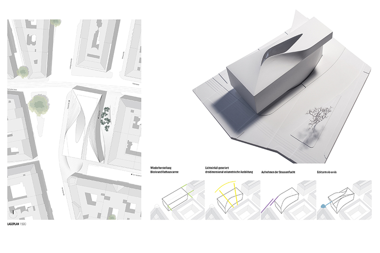 Das Thema eines neuen Gebäudes im Rathauskarree steht im Spannungsfeld der beiden Möglichkeiten, entweder das diesem zugrunde liegende Regelwerk zu akzeptieren und darzustellen, oder es als überkommen zu betrachten und aus diesem auszubrechen. Wir glauben jedoch, dass es möglich ist, diese scheinbaren Gegensätze miteinander zu versöhnen. Zunächst sehen wir keinen Grund eine herausstechende volumetrische Ausformulierung, vor allem in der