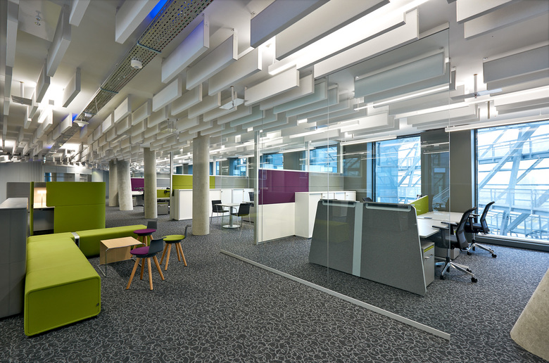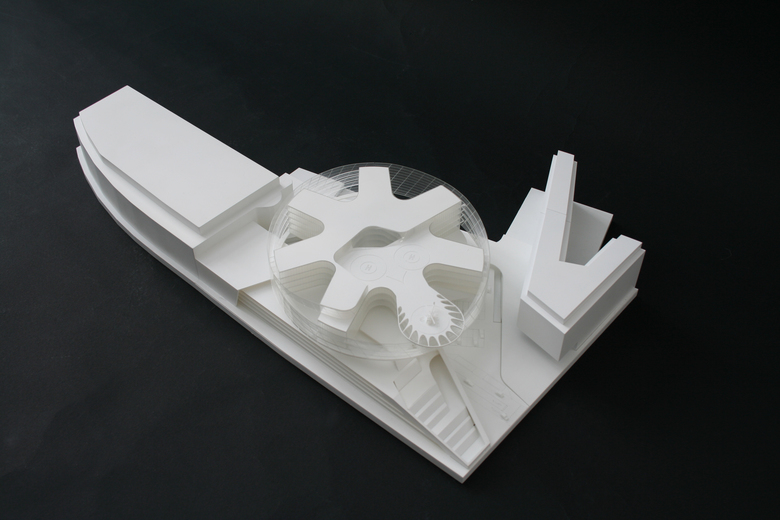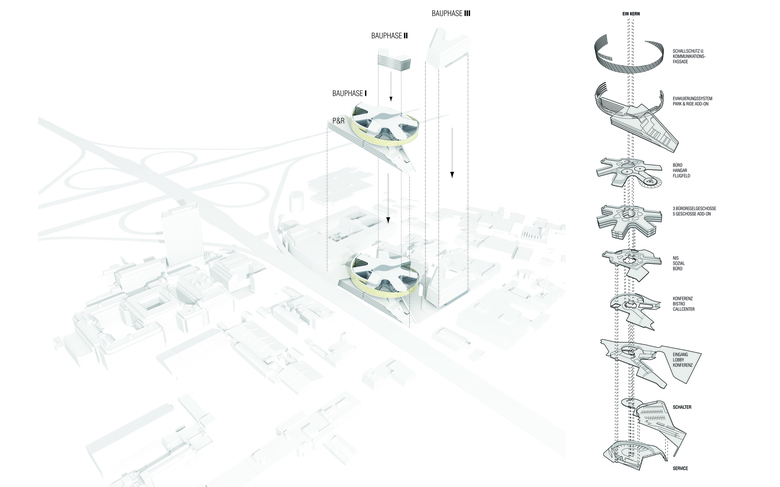 Von den Servicewerkstätten bis zum Heliport sind alle Programmelemente an einer einzigen vertikalen Achse aufgefädelt, also auch vom Schalter über den Empfang und die Veranstaltungsbereiche bis zum großen Atrium der Büros. Logistisch kompakte Inhalte mit hoher Effizienz, wie sie Stützpunkteinrichtungen per definitionem zueigen sind, wurden hier transformiert gedacht und in übersetzter Form auf das Gebäude übertragen.