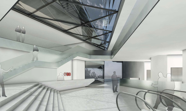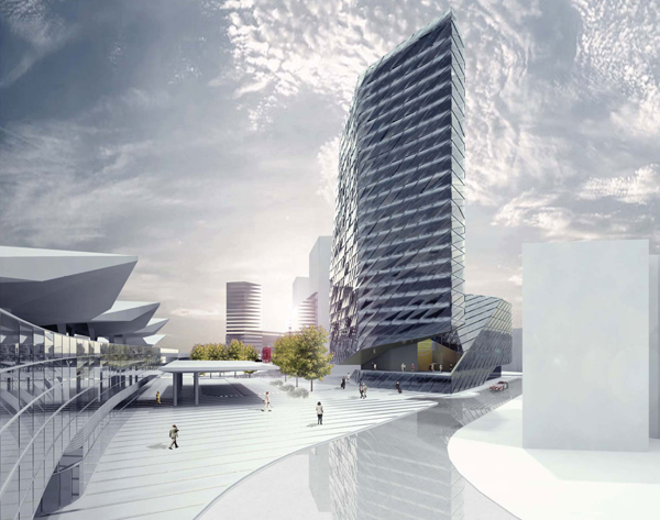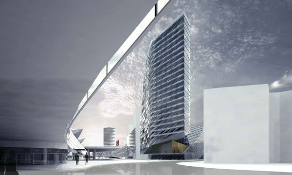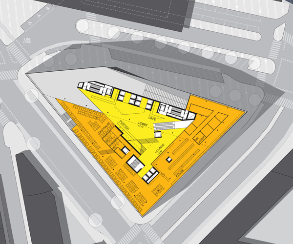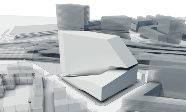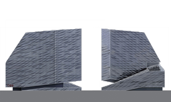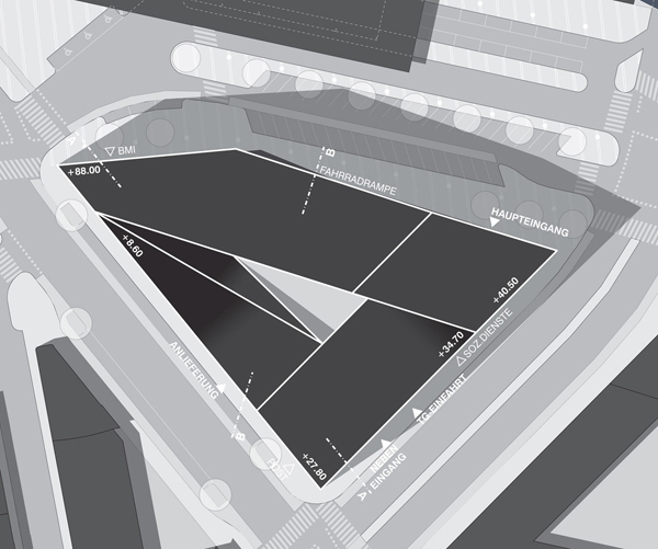 Wir schlagen ein Gebäude vor, das sich nicht als Solitär, sondern als Teil der Masse der Stadt verstehen soll. Die städtebaulichen Randbedingungen formen das Gebäude, welches aber gleichzeitig den Passanten und Nutzern städtische Präsenz zurückgibt. Vorgegeben sind die Gebäudehöhen von 21, 35 und 88 Meter Höhe. Diese Höhen werden kontinuierlich verschmolzen. Die notwendigen Lichteinfallswinkel auf die Nachbargebäude sowie die Bestimmungen über die zulässige Gebäudehöhe in Abhängigkeit der Straßenbreite und Bauklassen geben dem Gebäude den letzten Schliff. Die entstehende Spiralform wirkt einerseits als markante, von der Ferne sichtbare Silhouette, entwickelt sich jedoch andererseits fundamental aus dem Gehsteigniveau heraus, also von 0 auf 88 Meter. Dabei wird der Hochhausbaukörper unterschnitten, und es entsteht ein zweites städtisches und öffentliches Niveau als Pendant zur Hochlage des Bahnhofs. Dieses Niveau ist über eine Stufenrampe begehbar und fungiert als unabhängige Erschließung des 500-Plätze-Restaurants sowie als dessen gedeckte Terrasse. Die Rampe entwickelt sich weiter zum Dach der halböffentlichen Funktionen, wie zum Beispiel der des Konferenzzentrums, und bildet durch die Schräge gleichzeitig den städtebaulichen Auftakt zur höhenmäßig beschränkten Sonnwendgasse. Die Dachfläche steigt in der verlängerten Argentinierstraße weiter an, hier befinden sich die Fremdfunktionen, um dann radikal zum Turm – besser „Flügel“ – aufzusteigen. Dieser enthält die reinen ÖBB-Bürogeschoße und erfüllt alle Anforderungen eines Hochhauses mit zwei Brandabschnitten pro Geschoß. Vorgegeben ist weiters eine umlaufende Arkade, die zum überwiegenden Teil auf Straßenniveau verwirklicht wird. Über die oben beschriebene Stufenrampe wird ihr Niveau jedoch angehoben und so als Terrassenfläche auf einer städtischen Bastei interpretiert. In dieser Bastei befinden sich die Funktionen der Polizei sowie hinter den Arkadenflächen alle weiteren Funktionen, deren unmittelbare Erreichbarkeit von der Straße sinnvoll und notwendig ist. Es hat sich daher ein kompaktes, funktional vollkommen ausgefülltes Sockelgeschoß entwickelt, in das jedoch für den öffentlichen Raum eine breite Schneise geschlagen ist. Hier sticht man vom Platz her mittels Rolltreppen und Besucherlift in die auf Ebene 1 liegende Lobby, die wiederum eine Sichtbeziehung zum Außenraum eröffnet. Durch das Glasdach an der südlichen Hochhausfassade vorbei und über den unter dem Hochhausflügel durchtauchenden Trakt der halböffentlichen Funktionen hinweg blickt man gegen den Himmel. Von hier aus erreicht man einerseits über Vereinzelungsanlagen die Liftgruppe des Büroturms der ÖBB und andererseits die zweite Liftgruppe, die sämtliche anderen Funktionen, interne wie externe, halböffentliche wie nicht-öffentliche, bedient, sowie auch das Restaurant. Zusammenfassend sei nochmals gesagt, dass die städtebauliche Großform – die Spirale – auch im Kleinen platzräumlich sowie leitend und ordnend wirksam wird. Trotz der „Aufhebung“ der klassischen Sockelzone kann die geforderte Gesamt-Bruttogeschoßfläche nachgewiesen werden, da Luftigkeit und Schlankheit von Westen gegen bewusste Massigkeit von den anderen Richtungen gesehen ausgespielt wird. Ganz nebenbei entsteht eine Antwort auf die räumlichen Qualitäten des Bahnhofs und seiner Dachflügel – und damit ein Stück Corporate Identity für die ÖBB.