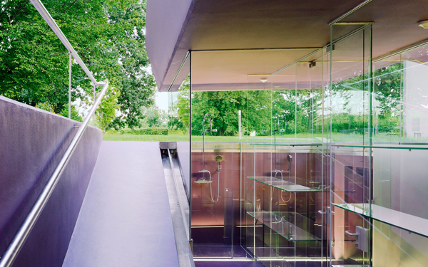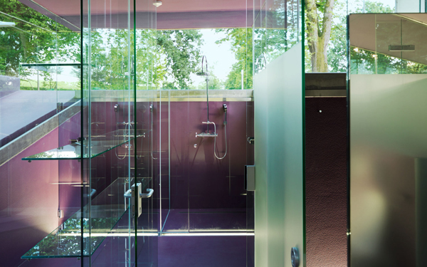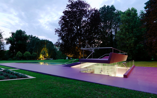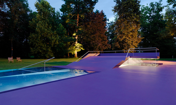 Becken, Beckeneinstieg, Liegeterrasse, Spielplatz, Sitzrampe sowie Sonnendeck werden als Zonen einer einzigen Figur aufgefasst, die mit Polyester bzw. Polyurethan völlig homogen beschichtet im Rasen des Parks liegt. Wo sich diese Figur als Sitzrampe aus dem Rasen in die Höhe klappt, wird unter Niveau Platz für Umkleiden und Nebenräume freigegeben, die als Nurglaskonstruktion unter der frei tragenden Betonkonstruktion angeordnet sind. Beckeneinstieg und Sitzrampe sind an deren Oberfläche wellenförmig verformt, sodass anatomisch geformte Sitz- und Liegemulden entstehen.