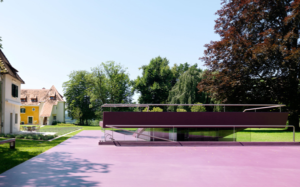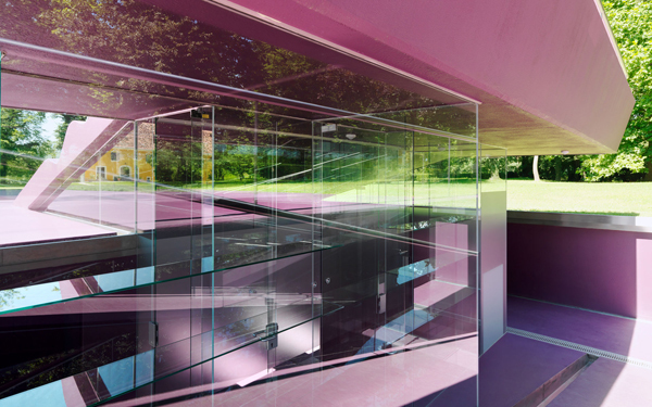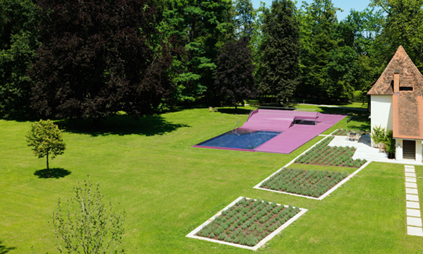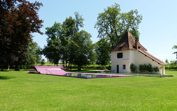 Aus diesem Gesamtprojekt entwickelten sich zwei Einzelprojekte: eine Wohnlandschaft im Erdgeschoß des Schlosses aus leuchtenden Möbelkörpern, die nach außen nur minimal in Erscheinung tritt und eine Badelandschaft, außerhalb der ehemaligen Schlossmauer am Eckturm zum Park hin situiert: die große Liegende in Polyester.