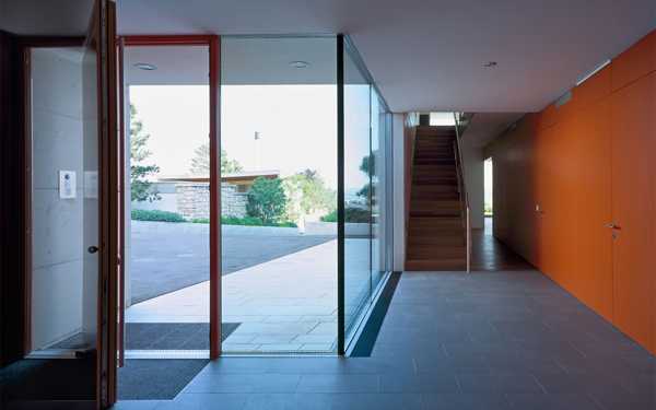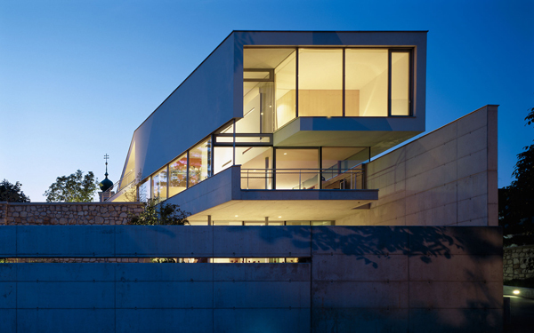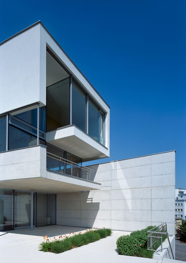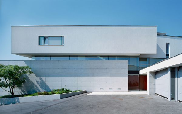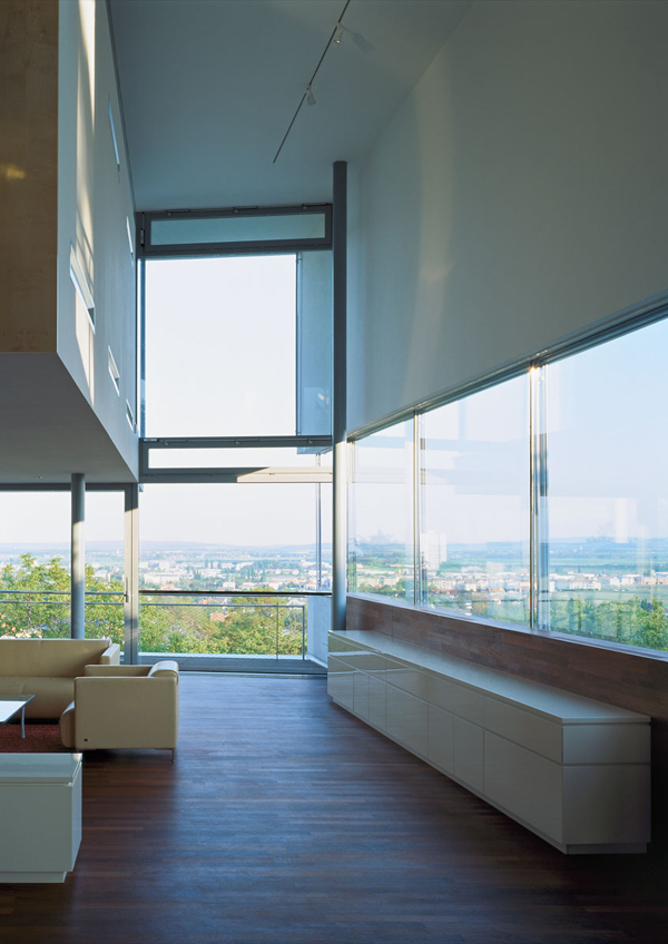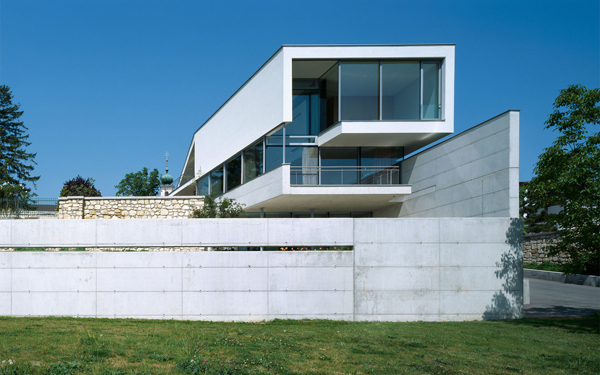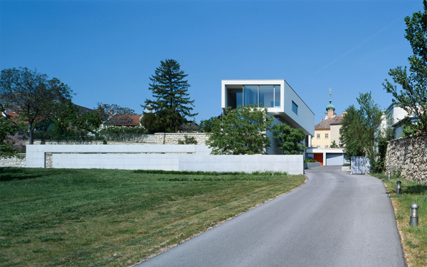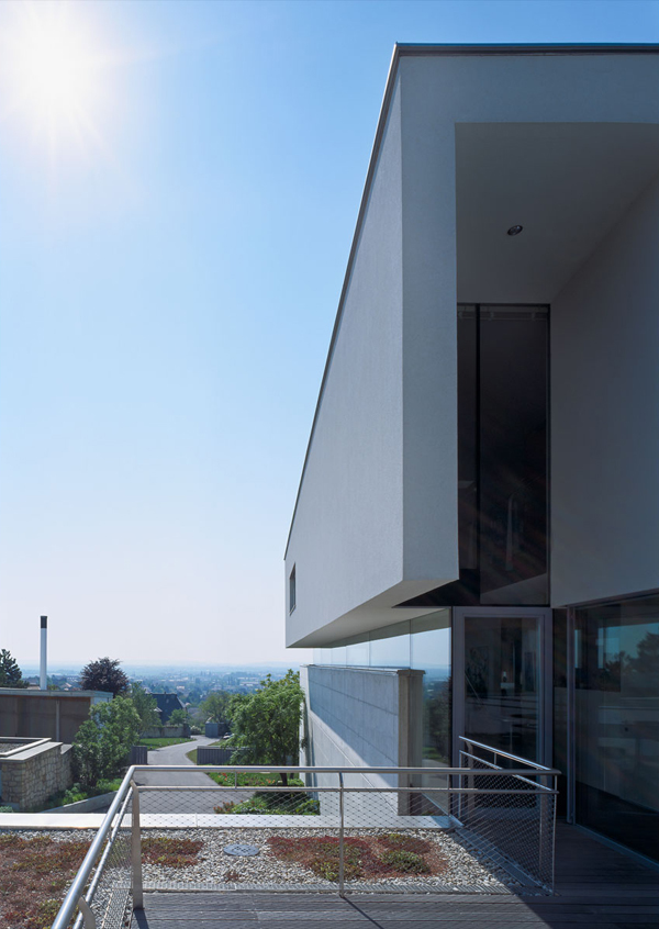 Stadtstruktur, Gartenstruktur und Landschaftsstruktur sind Ausgangspunkte dieses Projekts für gehobenes Wohnen und werden zugleich in diesem verdichtet. Der Baukörper entwickelt sich aus der Längsrichtung der schmalen Hofzeilenhäuser, hebt sich über die steinernen Stützmauern und unterschiedlichen Niveaus einer Gartenanlage und kragt weit aus, um den Blick in die Weite der südlichen Landschaftsebene aufnehmen zu können. Die Anlage wird von einer eigenen Zufahrtsstraße erschlossen und präsentiert sich dem Ankommenden in einer dualen Materialität: Sorgfältig geschalte Sichtbetonwände verhandeln die Berührung mit den sich in das Gebäude hineinziehenden Gartenebenen und schirmen gleichzeitig die Privatheit schützend ab, während eine abstrakte, weiß verputzte Hüllstruktur sich einerseits in der Stadtstruktur verankert, andererseits aber über der Sichtbetonstruktur zu schweben beginnt. Beide Strukturen berühren sich nicht: Durch das offen lassen eines Dazwischen kann der Innenraum ungehindert in den Außenraum fließen und umgekehrt. Lediglich Glas bildet eine thermische Trennung zwischen diesen beiden Räumen. Die Anlage beherbergt drei Wohneinheiten, wovon zwei zu einer Großwohnung zusammengeschlossen sind, und verfügt über einen ausgedehnten Fitness- und Wellnessbereich. Neben den Primärmaterialien der Außenwände Sichtbeton und Putz, die sich als solche auch im Innenraum zeigen, finden weiters innen Holztäfelungen Verwendung, welche Stau- und Nebenräume sowie die Türen zu den Zimmern gleichermaßen homogen verkleiden, um die Klarheit der primären Material- und Raumkonfiguration zu unterstreichen.