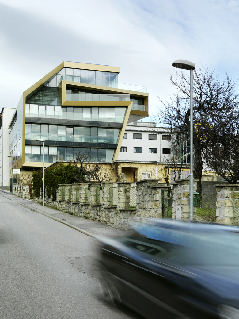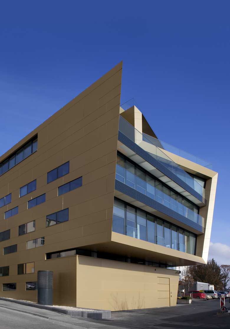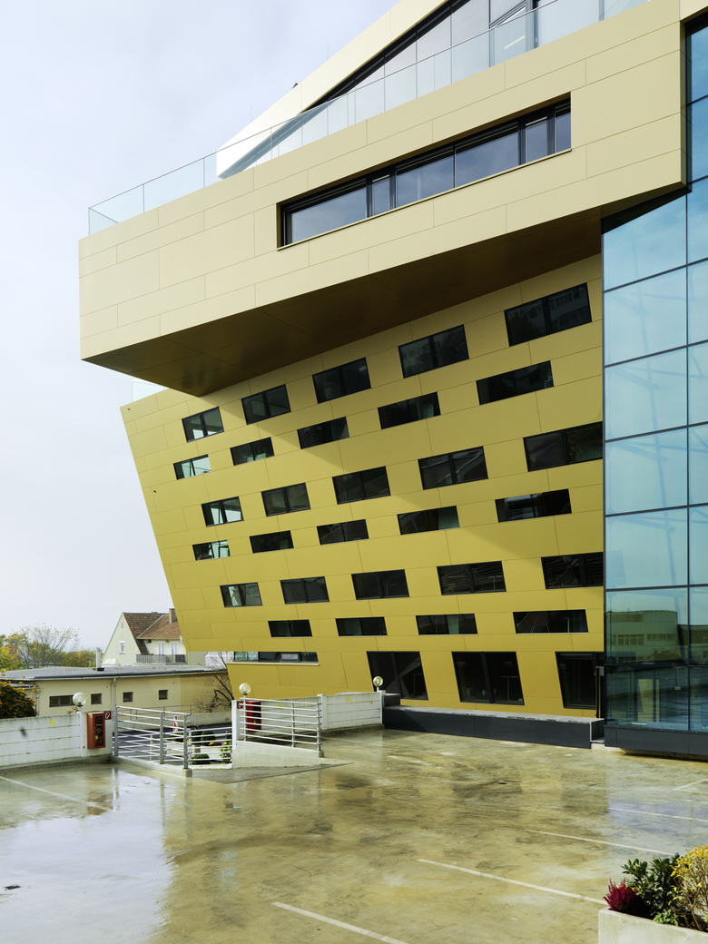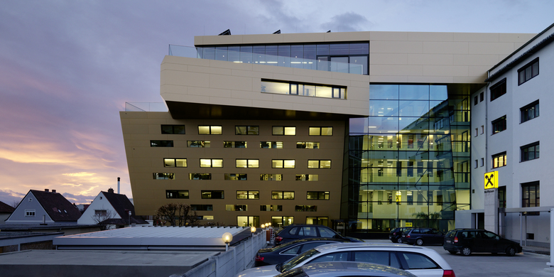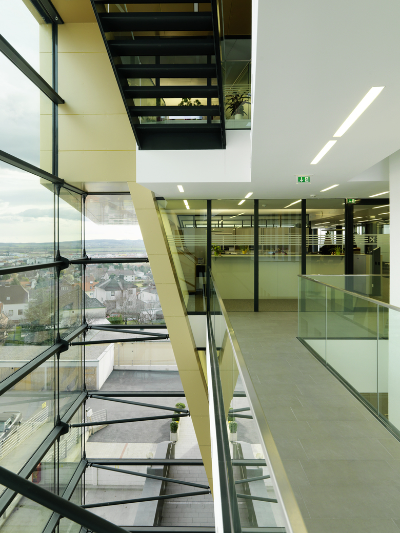 Diese Grundidee - zitiert aus dem Erläuterungsbericht zum Wettbewerbsbeitrag - wurde vertieft und weiterentwickelt. Nach Osten und Westen ist das Gebäude in eine metallische Fassade aus Alucobond-Platten gehüllt, die von einer eigens entwickelten Fensteranordnung perforiert ist. Diese Anordnung ermöglicht ungewöhnliche Ausblicke, bietet den MitarbeiterInnen aber auch eine fast intime Arbeitsatmosphäre und schützt vor Blendung bei der Bildschirmarbeit. Die Größe der Fensterflächen ist auf das notwendige Ausmaß hinsichtlich der Richtlinien für Arbeitsstätten ausgelegt. Es kann damit eine größere geschlossene Wandflächen erhalten werden, die durch ihre bauphysikalischen Eigenschaften (gute Wärmedämmung und gute Wärmespeicherung) zur Optimierung des Energiehaushaltes des Gebäudes beiträgt. Die raumhohen Glasfassaden nach Süden tragen dem großartigen Ausblick in die Wulkaebene Rechnung und können mit regulativen Elementen (Sonnenschutzsystem) die Energie (Solarer Energieeintrag) in das Gebäude hereinlassen oder auch großteils ausblenden.