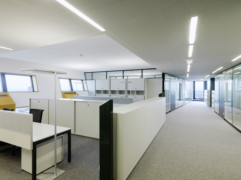 Der Innenraum ist als geregeltes Bezugssystem auf verschiedenen Bedeutungsebenen ausformuliert: Erstens als räumlich-materielles Konstrukt einer Ganzheit mit dem Gesamtgebäude: Das Material der Außenhülle ist Ausgangspunkt für das Materialkonzept auch im Inneren. Wie die Fassade sind auch die Fensterleibungen sowie die Fancoils mit Alucobond verkleidet. Die abgehängten Decken der repräsentativen Bereiche in den oberen Stockwerken sind aus gleichfarbigem Metall, sodass sich die Gebäudeaußenhülle gleichsam in den Innenraum herein zieht. Die unverkleideten Decken- und Außenwandbereiche sind in glattem Sichtbeton ausgeführt. Lichtgrau gestrichener Gipskarton für die abgehängten Decken über den Gangbereichen sowie für Teile der Bürotrennwände ergänzt gemeinsam mit dem schallschluckenden Gummi- oder Textilboden den Materialkanon der sanft abgestuften Grautöne. Der elegante neutralisierende Hintergrund ermöglicht das individuelle Bespielen der Arbeitsfläche mit Farbakzenten, womit besondere Bereiche, Sphären oder Bedeutungen hervorgehoben werden können.