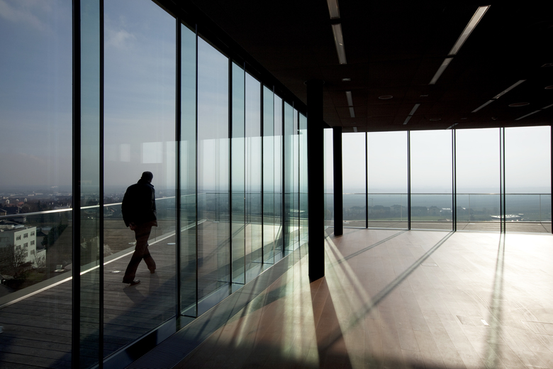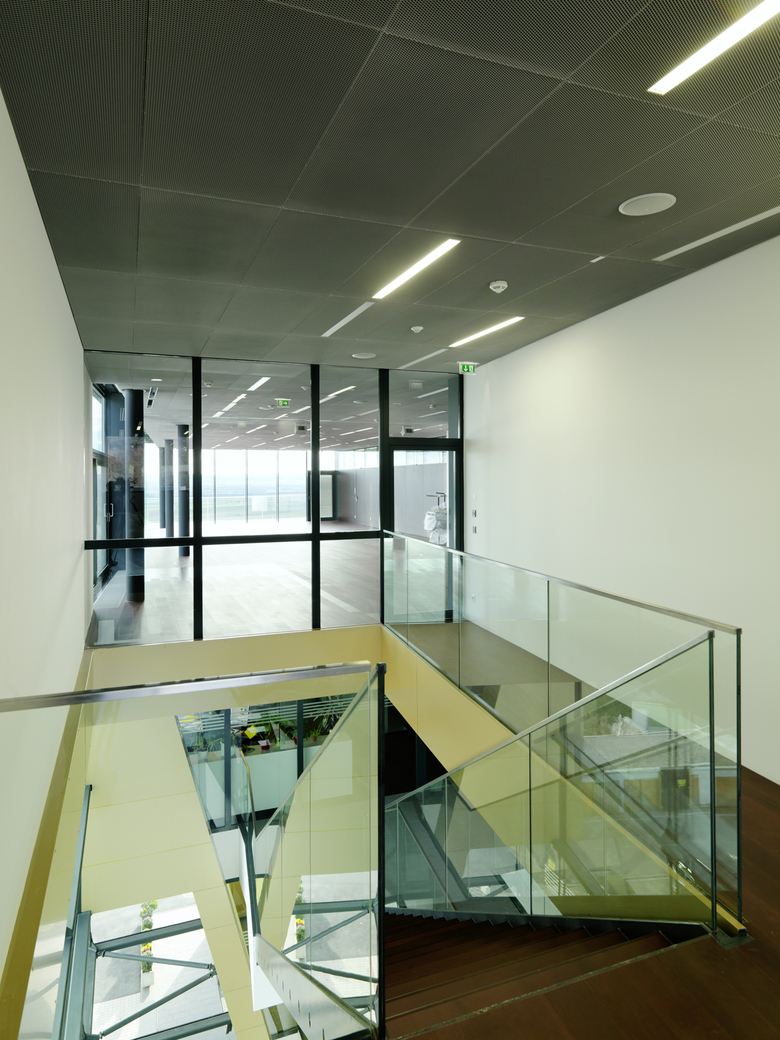 Zweitens in der Steuerung der Innen-/Außenraumbeziehung: Die Bürowände zu den Gangzonen sollen prinzipiell als Glastrennwandsysteme ausgeführt werden, deren Durchsichtigkeit über Folienbesatz gesteuert werden kann. Dadurch sind Einblicke, Durchblicke und Ausblicke in der nach Vorgabe möglichen Art und Weise steuerbar, Transparenz und Raumtiefe erlebbar, ja wird sogar der Außenraum und die Landschaft bis in den innersten Bereich des Gebäudes herein getragen. Die Innenarchitektur soll Raumbeziehungen ermöglichen und nicht verbauen.