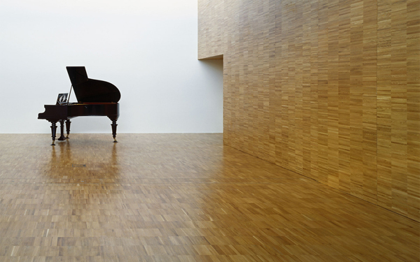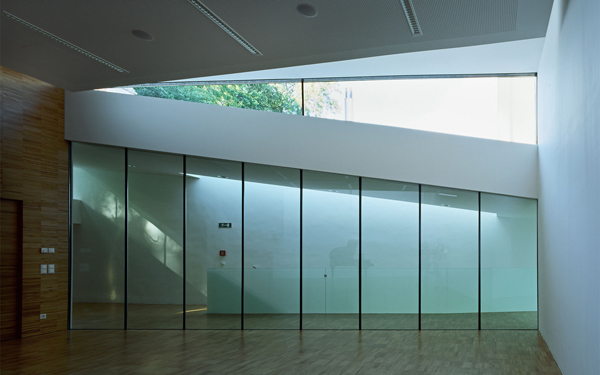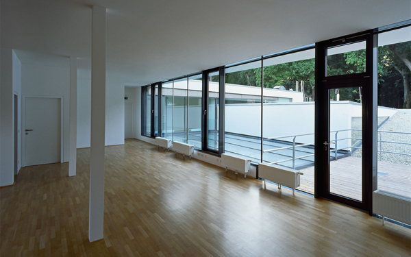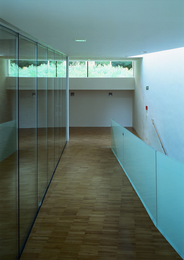 Die Materialsprache folgt in der reduzierten Weise den tektonischen Konditionen der Raumbildung. Grauweiße Oberflächen egalisieren die Differenz von Boden, Wand und Decke, die homogen erscheinende Raumstruktur wird durch Lichtintensitäten gegliedert. Im Obergeschoß klappt sich der Holzboden als Saalwand hoch und schält damit den Veranstaltungsbereich vom Foyerbereich heraus. Die Fußbodenebene des Dachgeschoßes schiebt sich als Holzterrasse Richtung Park aus dem Gebäude heraus, um dann in der den Saal und das Foyer überdeckenden Dachebene als aufgespaltene Dachschleife seine Kontinuität zu finden und sich letztlich wieder Richtung Straßentrakt zurückzufalten.