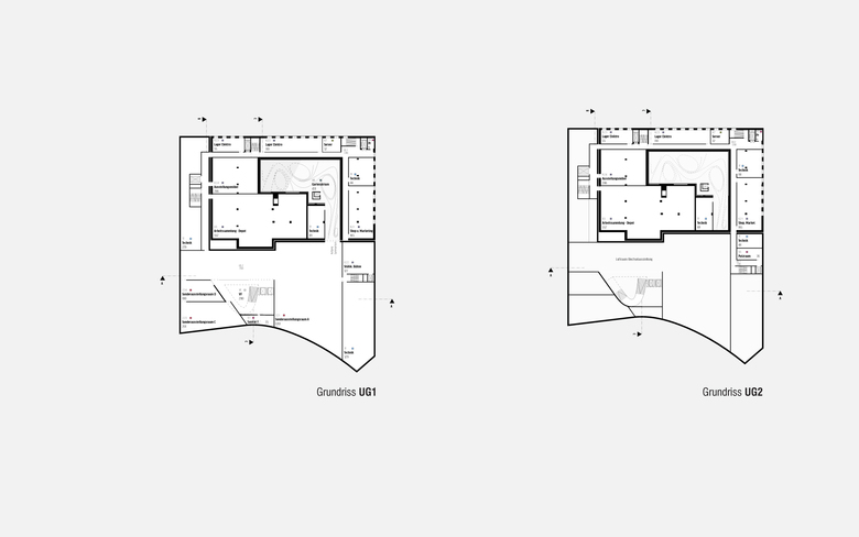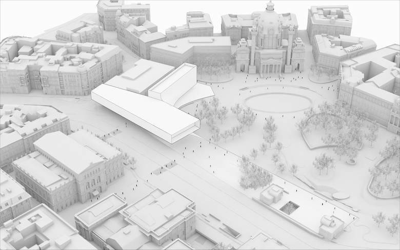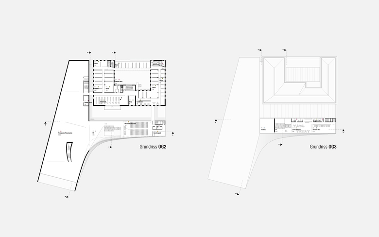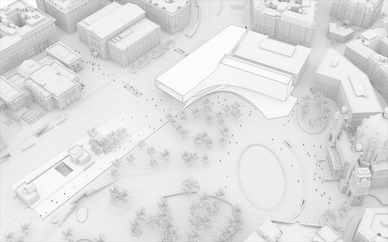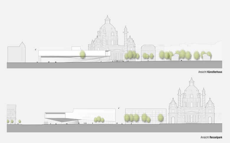 Eine Bewegung aus der Längsrichtung des Karlsplatzes kommend, beginnend mit den Otto-Wagner-Pavillons, umspielt das bestehende Museum und teilt sich in zwei Richtungen, die volumetrische Ausformungen erzeugen: einen horizontalen Flügel und einen vertikalen Flügel.