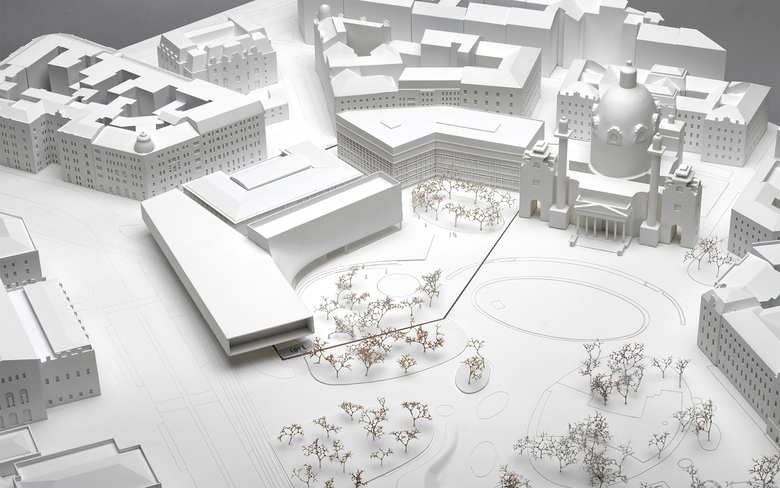 In größerem Maßstab betrachtet, erhält das Museum die Wertigkeit und Position des Konzerthauses und Akademietheaters, in Spiegelung um die Achse des Schwarzenbergplatzes.