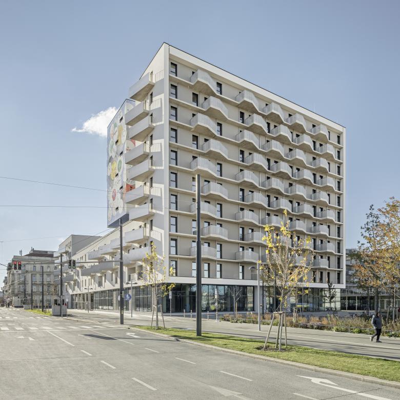 Die Wohnungen sind nach dem Wohnungsschlüssel für die „Gemeindewohnungen NEU“ in Fläche und Anzahl geplant. Insgesamt befinden sich 165 Wohnungen am Bauplatz. Die Wohnungen an den Laubengängen bieten zusätzlich zum Balkon auch am Laubengang einen kleinen Freiraum. Ausgewählten Wohnungen wird statt dem Balkon an de Straßenseite der gesamte Laubengang zugewiesen. Dies ist möglich, wenn kein Erschließungsweg einer weiteren Wohnung über diesen Laubengang erschlossen ist. Die Wohnungsgrundrisse sind einem etablierten System unterworfen. Vom Gang oder Laubengang gelangt man in einen kleinen Vorraum oder Windfang von welchem in den meisten Fällen der Wohnbereich betreten wird. Bad und Zimmer sind über einen „Intimgang“ erreichbar. Ein weiteres Identitätsbildendes Merkmal sind die verschiedenen privaten Freiraumangebote. So gibt es einerseits die bereits erwähnten Laubengänge und Balkone auf Laubengänge, aber auch Einzelbalkone an den Außenfassaden, durchgehende Balkonplatten an der Südfassade des Hochhauses, aber auch Loggien, welche sich im 1. Obergeschoß des Gebäudes befinden. Die schräg zugeschnittenen Einzelbalkone spielen bewusst mit der Austrittssituation aus den Wohnräumen und weiten sich am anderen Ende auf.