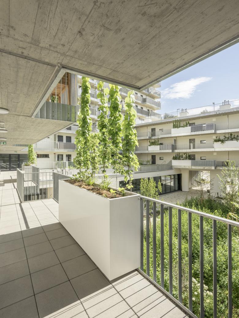 Die Laubengänge sind durch die erdgebundene Vertikalbegrünung und durch Pflanztröge begrünt, die für Bewohner/Innen ein zusätzlicher wohnungsbezogener Freiraum sind.