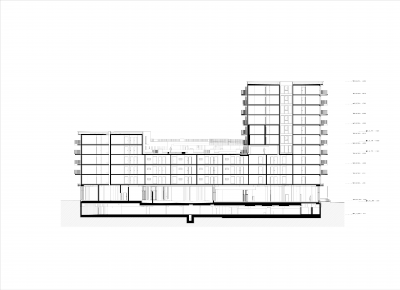 Das Gebäude gliedert sich in zwei unterschiedlich hohe Baukörper. Bauteil A hat ein Fluchtniveau von maximal 13,55m. Die jeweiligen Gangflächen sind mittels einer Schleuse an das Stiegenhaus angebunden. Eine ungehinderte Anleiterbarkeit der Fassaden ist an allen Betroffenen Stellen gegeben. Bauteil B hat ein Fluchtniveau von maximal 30,90m. Dieser Bauteil verfügt über ein druckbelüftetes Sicherheitsstiegenhaus mit Feuerwehraufzug. Alle betroffenen Fassaden sind von den vorgesehenen Aufstellflächen aus mittels Löschwasserangriff zu bedienen. Der vertikale Brandüberschlag an der Nordseite des BT B wird mittels durchlaufender Brandschutzriegel gewährleistet. An den übrigen Fassaden wird der Brandüberschlag mittels ausreichend ausladender Balkonplatten oder ausreichend hoher Parapete unterbunden.