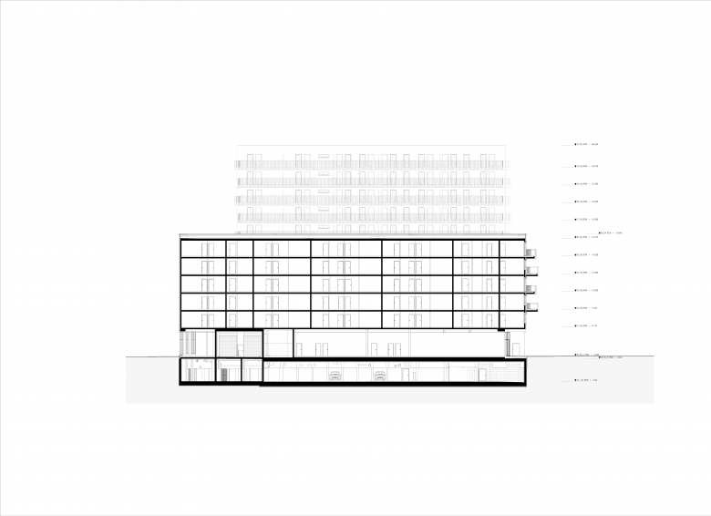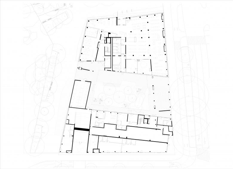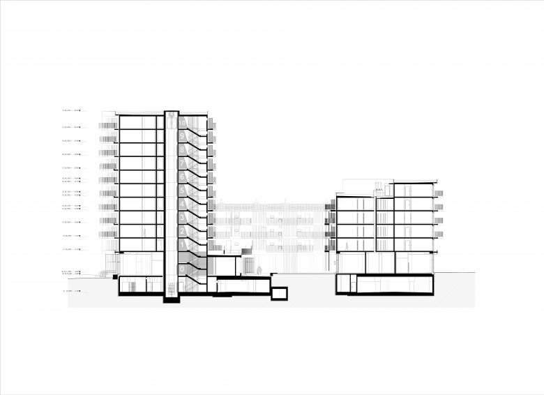 Das System der verdichteten Baustruktur zugunsten größerer Freiräume wird auch am gegenständlichen Projekt angewandt. So werden die beiden höheren Bauteile des Gebäudes äußerst effizient und kompakt errichtet. Zugleich wird der dadurch freigespielte Raum den Bewohnerinnen und Bewohnern des Gebäudes als Freiraum zurückgegeben. Durch diese Maßnahmen ist es gelungen den Innenhof des Gebäudes gegenüber der vorgeben Baulinien weiter zu öffnen und auch eine großzügige öffentliche Durchwegung durch den Bauplatz zu implementieren.