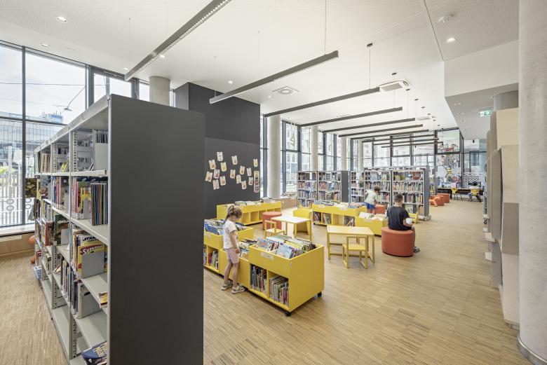 Der große Gemeinschaftsraum mit integrierter Waschküche und Fahrradwerkstatt wurde dem im Innenhof angeordneten Grünraum zugeordnet und bietet somit eine hohe Aufenthaltsqualität. Ein weiterer Gemeinschaftsraum befindet sich am Quartiersbalkon im 4. Obergeschoß des Gebäudes. Dieser Gemeinschaftsraum steht in direkter Verbindung zur großen Dachterrasse auf welcher auch der Kleinkinderspielplatz untergebracht ist.