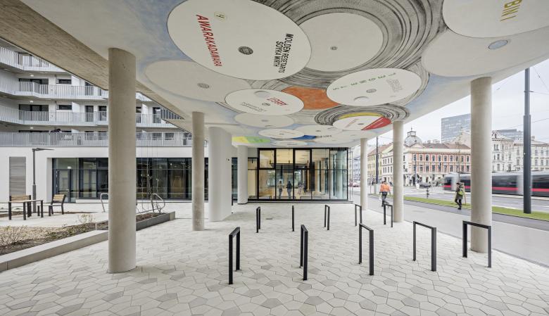 Von den Erschließungskernen sind auch die beiden Laubengangtrakte erreichbar. Markenzeichen für dieses Objekt sind die umlaufenden Erschließungsgänge im Innenhof des Gebäudes. Diese folgen in ihrer architektonischen Struktur einem klassischen Wiener Pawlatschenhof, sehen sich selbst aber als Neuinterpretation dieses klassischen Bautyps.