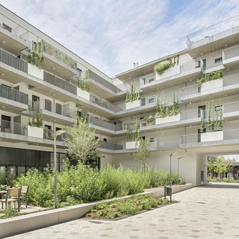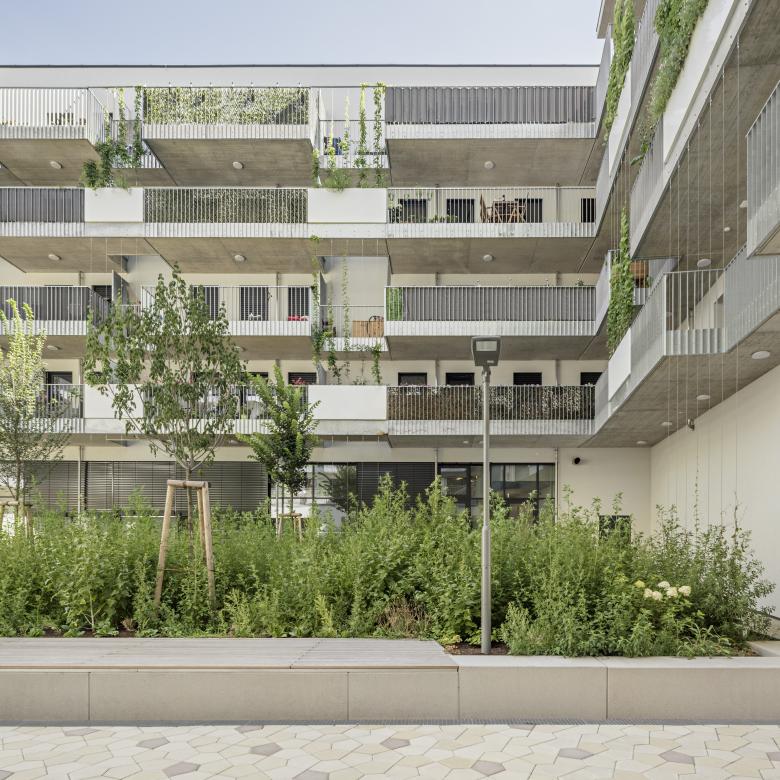 Auf den Dachflächen bilden großzügig angelegte Gemeinschaftsterrassen Raum für sozialen Austausch. Die Dachterrassen ergänzen das Angebot für die Bewohner/Innen und sind unterschiedlichen Schwerpunkten gewidmet. Die Dachterrassen im OG 1 bietet in erster Linie Aufenthaltsmöglichkeiten. Die große Dachterrasse im OG 4 ist mit einem Gemeinschaftsraum kombiniert. Sitzmöglichkeiten, Pflanzflächen und ein Kleinkinderspielplatz schaffen Aufenthaltsqualität. Auf der kleinen Terrasse lädt eine Urban Farming Fläche zum Gärtnern ein. Der begrünte Hof nutzt den Erdkern für Baumpflanzungen mit schattenverträglichem Unterwuchs und übernimmt eine natürliche Kühl- und Klimafunktion. Die extensive Dachbegrünung wird mit artenreichen Mischungen begrünt und mit Totholzstrukturen angereichert und schafft so Rückzugsmöglichkeiten für frost- und trockenheitsempfindlichen Bodentierarten.