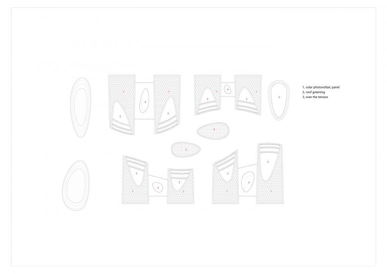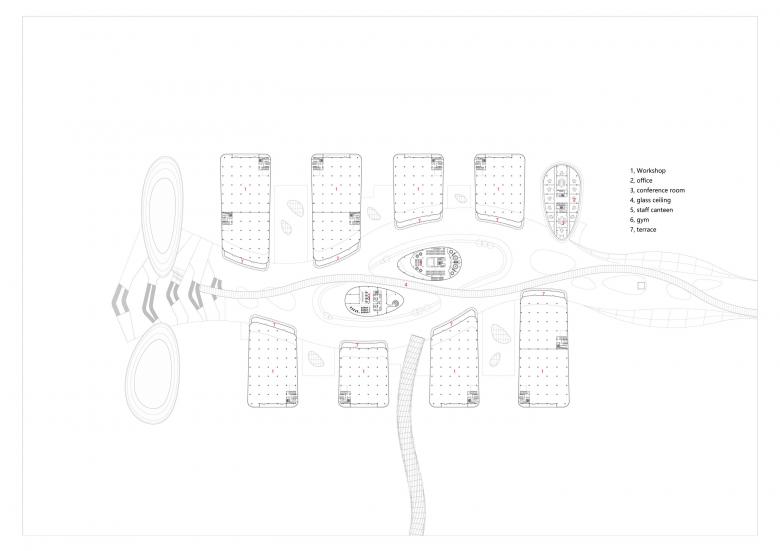 The pedestrian traffic line in the factory area is differentiated inside and outside according to different functions, and does not overlap with the vehicle traffic line, so that people and vehicles are separated from each other. Outside Purposeful Arrival: The pedestrian flow inside the base comes to the foyer of each single building on the first floor of the plant through the vertical traffic of the four corners. Inside leisure stroll: the east-west landscape leisure axis connects the whole factory area, and the offices of each single building can come to the landscape walkway smoothly through the landscape terrace.