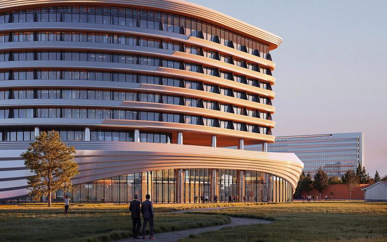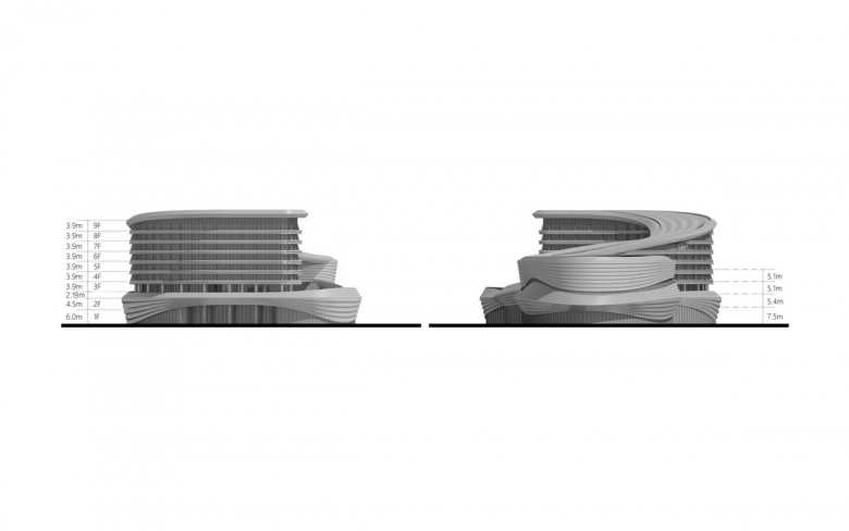 Characteristics of the form: large S-curve building profile + inward-looking courtyard. The isolated shape of the building intentionally distances the building from the elevated area to reduce the impact of noise, and the inward-looking courtyard creates a suitable internal space. The hotel and the exhibition are each equipped with an inward-looking courtyard, creating a private internal space experience, isolating the busy flow of people from the hospital outside and creating a comfortable space experience.