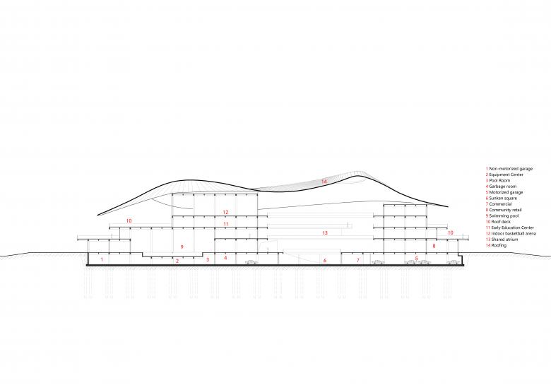 Scenario Generation - After using area to determine the volume, the space is cut up through the dynamic line, and landscape retreats are created to create a multi-first floor traffic system and three-dimensional landscape, ultimately forming a narrative space dominated by flow. The functional layout sets up seven scenarios: public space for citizens, fitness centre, training centre, arts and culture exhibition centre, community government centre, community convenience centre and community commerce. The whole forms a mixed block with complex functions. The plan adopts standardised unit design, flexible layout and sharing of functions, and sustainable operation.