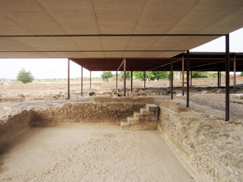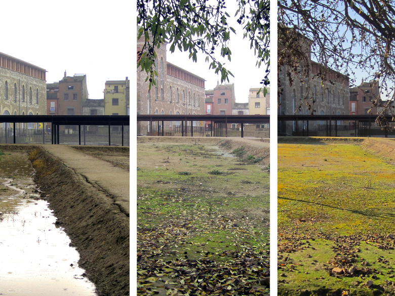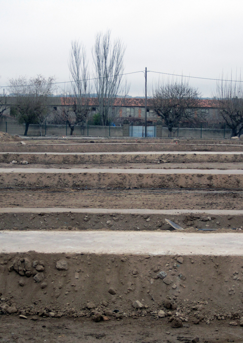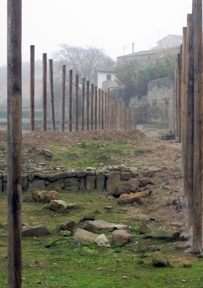 The antient Roman city of Iesso, founded in the year 100 BC, was found in the subsoil of the modern town of Guissona, occupying a surface space of some 20 ha in the farming landscape of the Segarra. The earth piled up by the archaeologists as a result of their excavations are reused as lamination surfaces containing any possible rainwater runoffs while dimensioning and connecting the old urban streets and structures that emerge from the 2-ha site. Other specific elements such as the rows of chestnut wood masts that dot the sections of sacked ramparts, steel tubes that edge the volumetry of the north tower, or the two horitzontal planes on foundation micro-piles that protect the baths and natatio are the instruments that enhance the visible parts of the site... mesh driven into the ground to prevent slipping in the tough and frosty continental winter, planks to bridge any small unevenness or lines of ropes to place non-accessible areas off limits are some of the elements used that seek to maintain a certain coherence by understanding Iesso as a 21-st century archaeological site and not a rebuilt Roman city. The interpretation of the different elements has thus always been understood from the viewpoint of abstraction, using the typical materials of the archaeologist and the farmer in earthen fields that host the spontaneity of life while awaiting future archaeological campaigns.