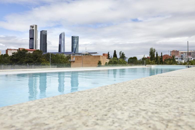 En la azotea, se resuelve una piscina infinity de agua salina con vistas sobre la ciudad y pavimento drenante.