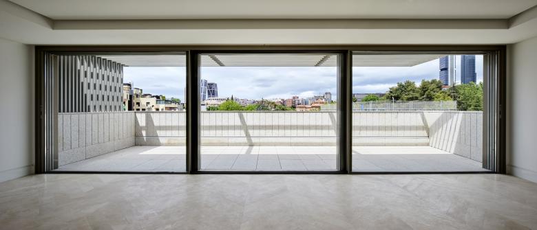 La composición de la fachada remarca los cuatro niveles del volumen mediante una línea de imposta corrida resuelta con un perfil de composite embebido en la piedra, del mismo material de las embocaduras de hueco, en color bronce. Los huecos modulados en 1,2 x 2,75 m, se resuelven sin partición interior con barandilla de protección exterior de vidrio sin carpintería. Disponen de persianas regulables, que permiten la entrada de iluminación natural y su graduación en todas las estancias.