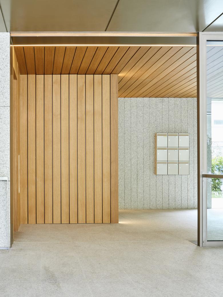 Tanto la fachada ventilada exterior como los revestimientos de las zonas comunes (cubiertas, terrazas e interiores) se resuelven con granito San Martiño como elemento de continuidad en todo el edificio. La madera empleada en zonas comunes aporta calidez a los espacios.