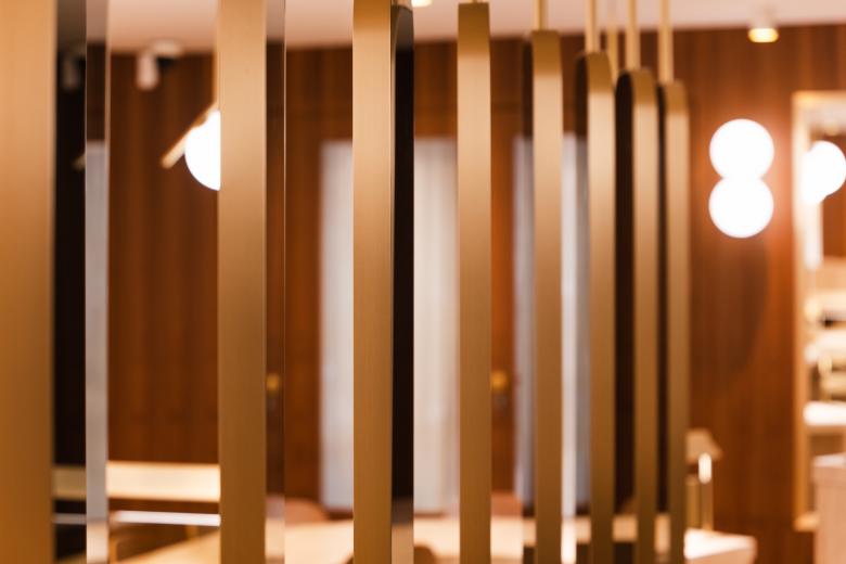 Gleich nach Betreten des Ladens eröffnet sich den Kunden eine angenehm entschleunigte Welt fein abgestimmter Farben, Formen und Materialien. Nur wenige natürliche und langlebige Materialien bestimmen das Raumerlebnis: Wandpaneele, Schubladen und Vitrinen aus dunkelbraun geräuchertem Platanenholz, Bodenfliesen und Einbaumöbel aus matt geschliffenem römischem Travertin sowie ebenso grazile wie präzise Ausstattungsdetails in matt gebürstetem Messing.