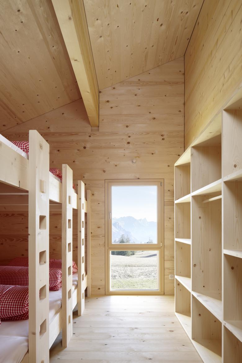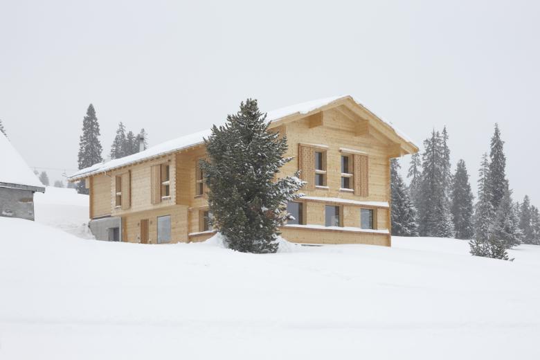 Der Neubau Alphaus Prod bildet zusammen mit dem Alpstall ein neues Ensemble. Die Nutzung verteilt sich über zwei Geschosse. Im EG befindet sich der Eingang mit Halle und Küche sowie diverse Nebenräume. Im OG die Schlafräume. Das Tragwerk besteht aus einem Strickbau mit normalem Konstruktionsholz C24.