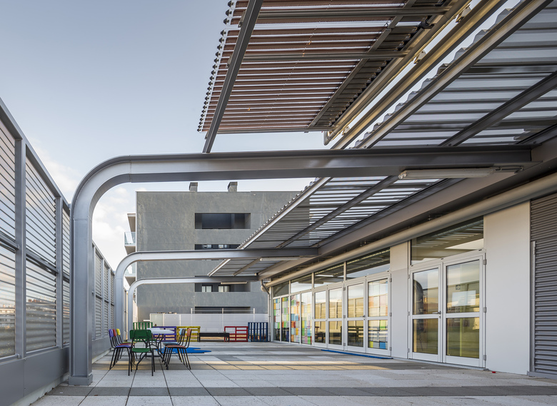 The green area has two important roles: both in the deck, where the school has planted a garden, and along the large medians where the building has its limits.