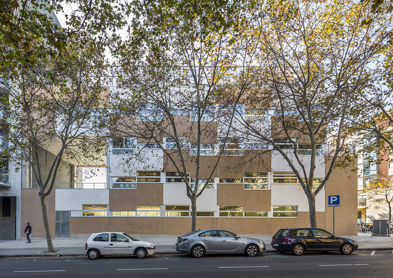 The location of the new building borders a public green space and a large block of flats. The site was part of an old industrial colony "Colonia Castells" which was transformed into a new public urban space, with building plots aligned to the street due to the growth of the city.
