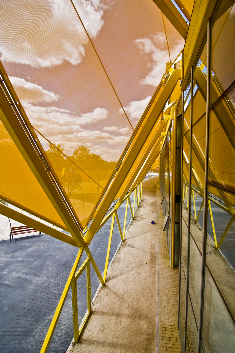 An important area of the building half-buried (50% of the building takes advantage of the land’s thermal inertia) and a large glass facade facing south (700 sqm) are basic decisions that shape the physical relationship between the building and its environment. A bioclimatic textile layer superimposed over a light steel structure is wrapping the rational concrete core of the building. This textile (partially movable, connected with sensors to sun position) is the interface between interior and exterior spaces, blurring the boundaries between private and public and extending the inner comfort to the public space.