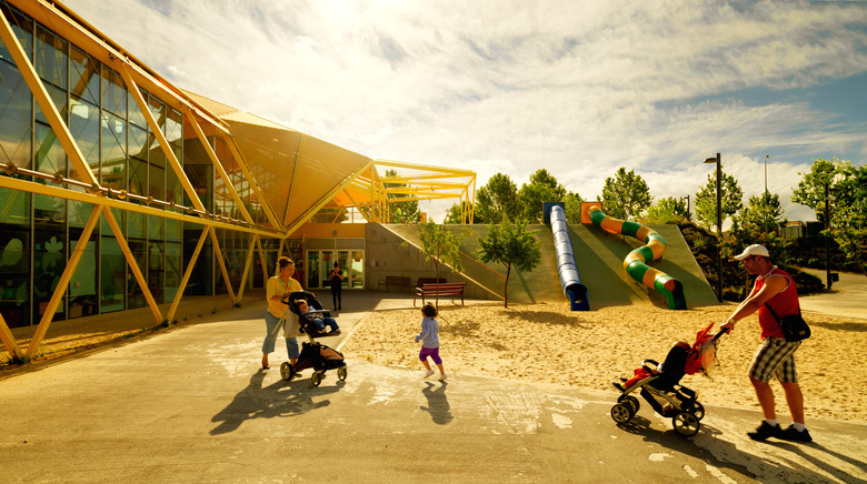 An artificial topography has been created as an enclosure and protection filter from the aggressive industrial environment, within the plaza it is easy to forget about the context and to imagine you are somewhere else, closer to nature.